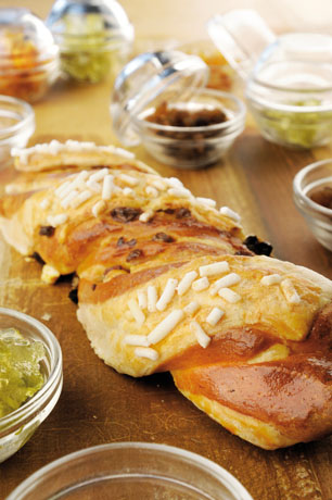 Raffreddate la pasta per 30 minuti in freezer o per 10 minuti in abbattitore. Stendete dei rettangoli di pasta dello spessore di 1 cm e lato 20×10 cm. Stendete la pasta a 2 mm di spessore e fatela riposare in frigorifero. Tagliate dei rettangoli della stessa misura di quelli preparati in precedenza. Per formare ogni kranz servono 3 rettangoli di pasta e 4 di sfoglia. Stendete un primo strato di sfoglia, inumidite con il tuorlo d’uovo, appoggiate il primo strato di pasta, inumidite ancora con il tuorlo, disponete sul piano ottenuto un po’ d’arancia e cedro canditi e dell’uvetta e coprite con la pasta sfoglia. Ripetete questa operazione fino a ottenere un parallelepipedo di 7 strati. Tagliate ogni parallelepipedo in due parti, prendetelo per le estremità ed effettuate con le mani un movimento di torsione per formare un’elica. Lasciate lievitare a 26°C per 6 ore. Spennellate con tuorlo d’uovo, cospargete di zucchero in granella e cuocete in forno. Un kranz di 500 g cuocete in 25 minutia a 175°C con valvola aperta.