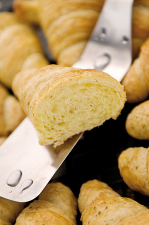 Impastate il poolish, la farina e il lievito. A metà impasto aggiungete il sale. Fate riposare l’impasto per 30 minuti a 5°C. Sfogliate due volte a tre pieghe con 250 g burro poi passate al freddo a 4°C per circa 40 minuti. Sfogliate nuovamente a tre pieghe e stendete la pasta a uno spessore di 4 millimetri. Tagliate nella classica forma a triangolo e avvolgete il croissant. Lucidate con un uovo sbattuto e lasciate lievitare per circa 80 minuti a 25°C. Dorate nuovamente e cuocete in forno con leggero vapore a una temperatura di 200°C.