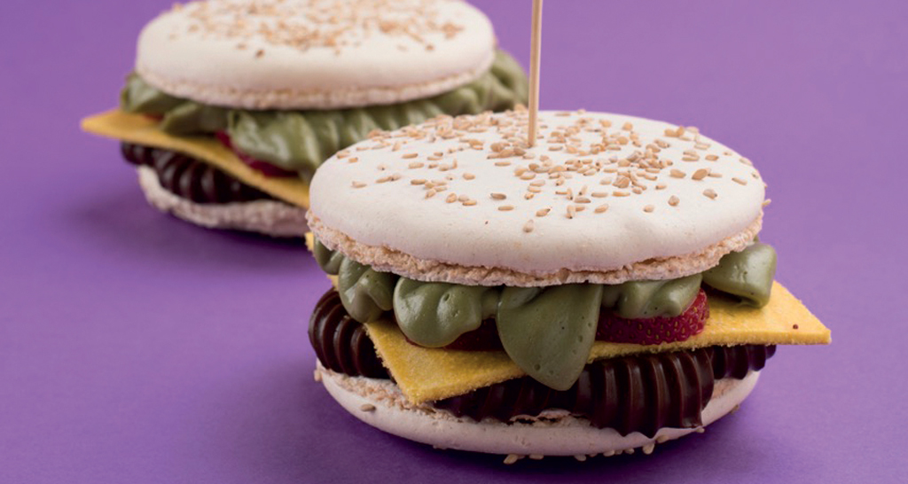 Il maestro Roberto Rinaldini ci mostra la tecnica per realizzare dei finti hamburger con due gusci di macaron alla vaniglia e una golosa farcitura di crema al cioccolato, pan di Spagna, fragole fresche e chantilly ai pistacchi.
