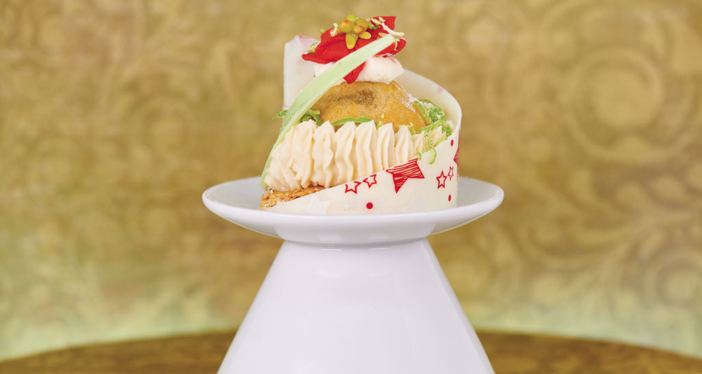 Coppate la sfoglia e ponete al centro un bigné farcito al pistacchio. Guarnite con ganache alle mandorle montata. Decorate con ciu etto di Prima Blanca Debic, cioccolato plastico, zeste di limoni di Siracusa e granellone caramellato agli agrumi di Sicilia.
