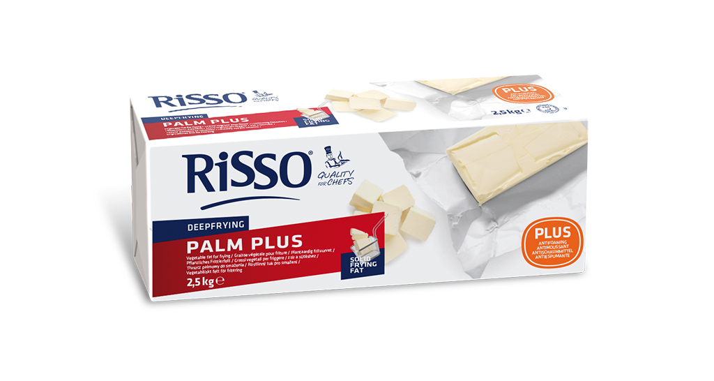 Dalla grande tradizione culinaria nordeuropea, riconosciuta per la particolare qualità delle sue fritture, Vandemoortele presenta il nuovo RISSO PALM PLUS. Si tratta del funzionale e pratico grasso per frittura 100% vegetale, prodotto interamente con olio di palma sostenibile e certificato. RISSO PALM PLUS è la scelta ideale per realizzare fritture asciutte, croccanti e ricche di gusto. RISSO PALM PLUS, nel pratico formato da 2,5 kg, è arricchito di agenti anti-schiuma, ingredienti funzionali alla lunga durata delle fritture, in particolare di prodotti pastellati.