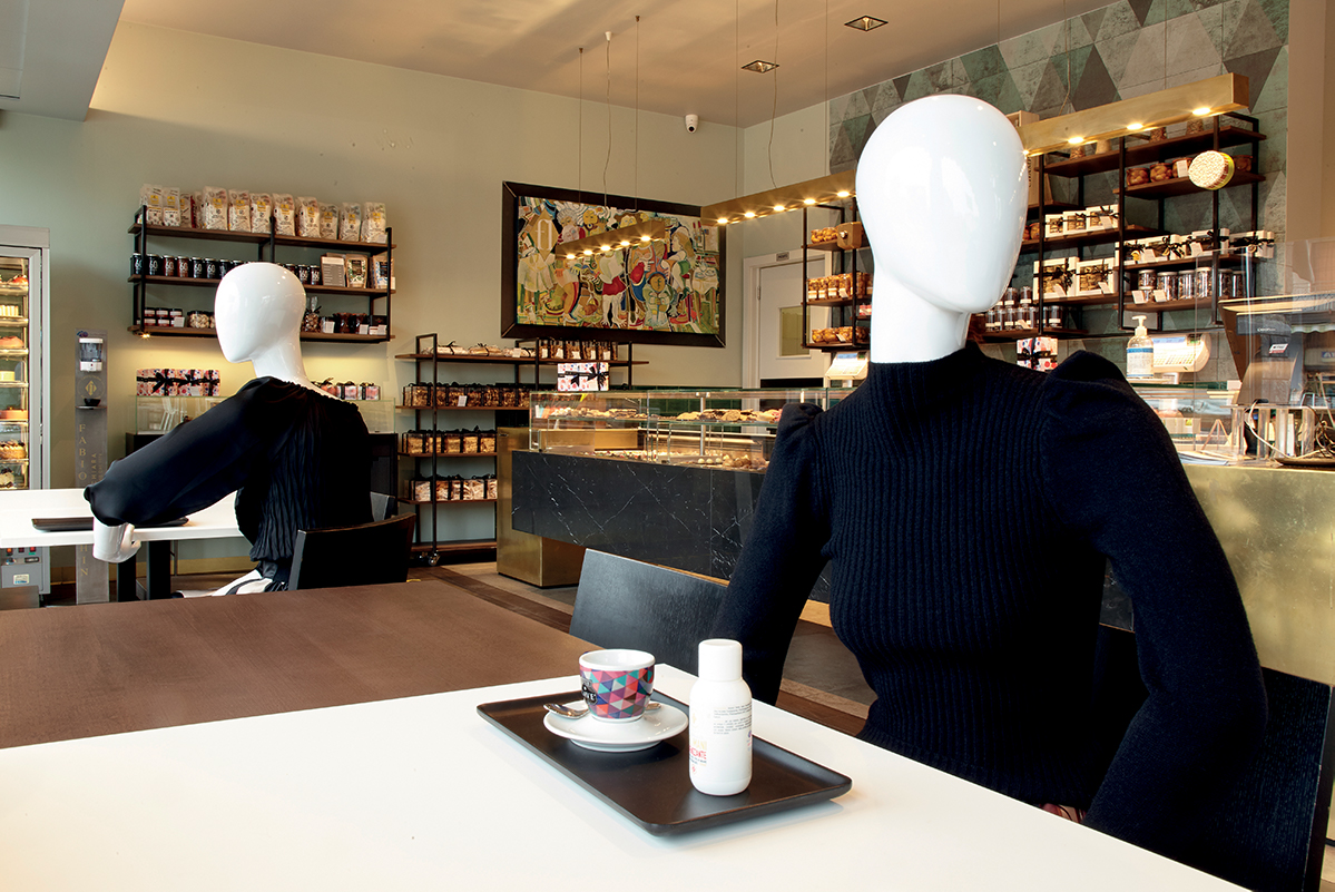 Connessioni è la parola chiave per Fabio Longhin della pasticceria Chiara di Olgiate Olona (VA). Proprio le reti connettive che si creano tra professionisti di vari settori sono ben rappresentate dall’opera Urbanbrain ideata dal creativo duo Urbansolid che il pasticcere ha subito adottato come simbolo del suo pensiero. Durante il primo lockdown, grazie a queste “sinapsi”, Fabio Longhin decise di trasformare la sua pasticceria in una galleria d’arte. A Urbansolid affidò la riproduzione di alcuni dolci, stilizzati e interpretati secondo lo stile colorato della Street Art. Da Marco Lusso di Barge (CN) “rubò” l’idea di far accomodare ai tavoli dei manichini, facendoli vestire da un negozio di abbigliamento, mentre a una parete appese un dipinto che rappresenta una caffetteria immaginaria.
