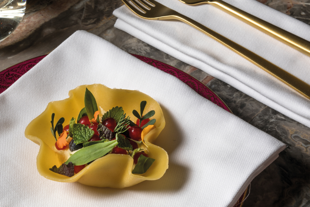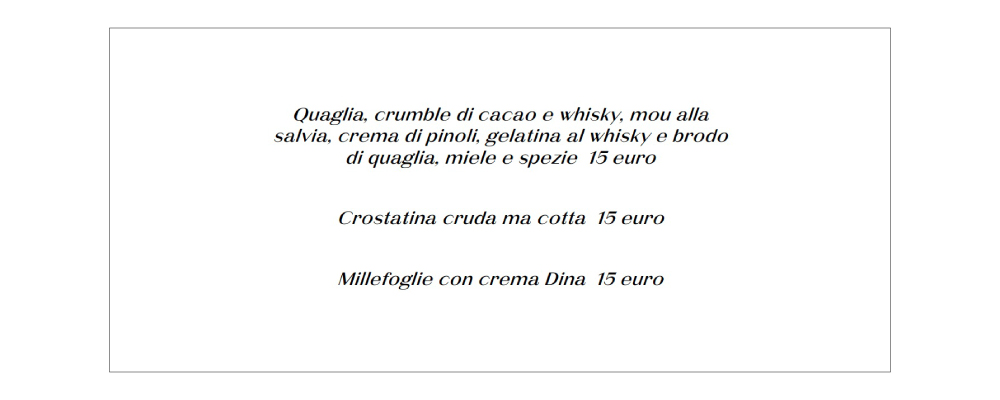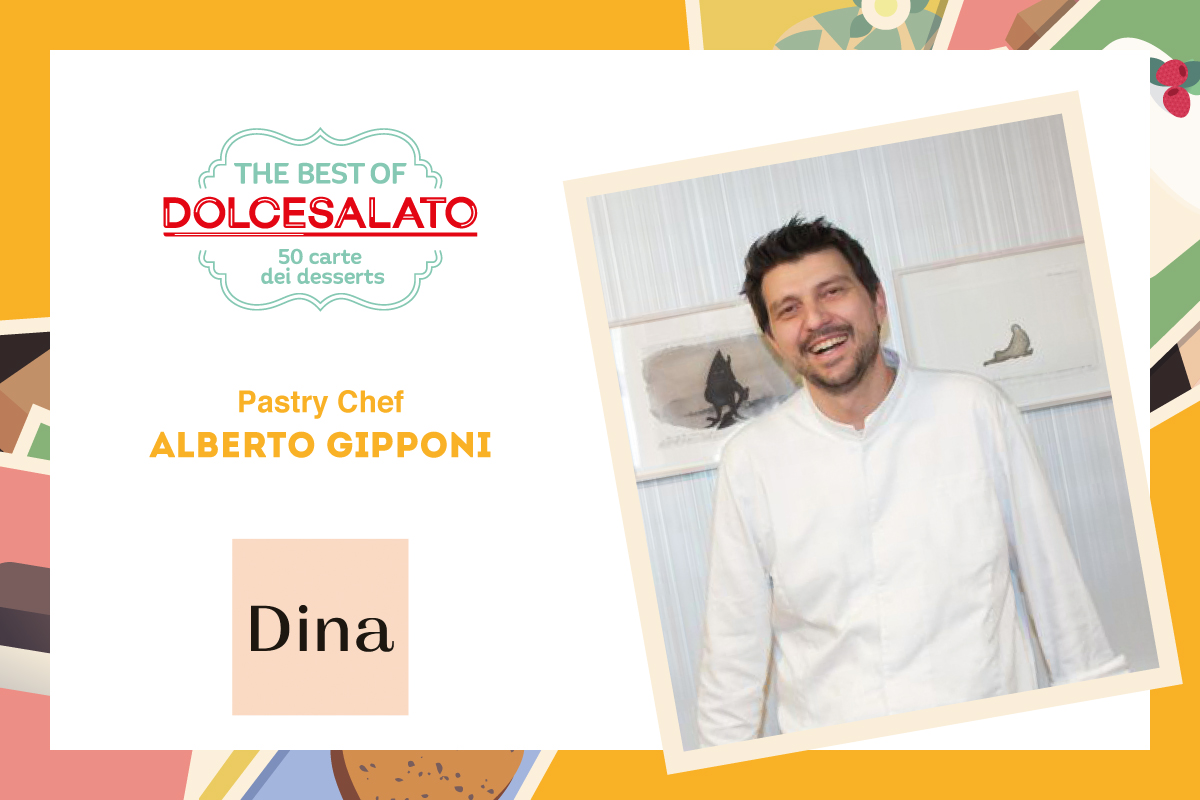 Alberto Gipponi ha iniziato la sua storia con la cucina a 20 anni e, dopo diverse esperienze con maestri importanti, quattro anni fa ha aperto Dina. Sin dall’inizio la sua si è caratterizzata come una pasticceria molto gastronomica, con dolci non dolci, grazie a ingredienti come quaglie e cozze che vengono inseriti nella proposta. «Nell’ultimo anno e mezzo la brigata di pasticceria è cresciuta di altre due persone e, insieme a Lorenzo e Ivan, siamo arrivati a proporre anche dolci più tradizionali. Abbiamo eliminato la carta dei dessert di per sé, io credo nell’armonia e nell’accoglienza, nel concetto di sartorialità, quindi i percorsi di degustazione sono stati creati per avere un senso anche in confronto ai dolci. Dopo quattro anni, abbiamo i nostri classici che incontrano le preferenze dei clienti, ma cerchiamo anche di osare – spiega Alberto Gipponi –. La sensazione che offro è il calore. Ti servo il calore: ad esempio lo spaghettino candito prende una consistenza particolare grazie all’inserimento dell’invidia ghiacciata, che con lo spaghettino sviluppa una percezione aromatica e allo stesso tempo gommosa, così quando finisci di masticare inizi a sentire questa sensazione di calore. Anche la millefoglie tradizionale Dina, sviluppata a quattro mani con Ivan (lui si occupa della sfoglia e io della crema) una volta montata devi mangiarla subito o non mantiene le sue caratteristiche». Al Dina tutti mangiano il dolce a fine pasto e Gipponi non lo avverte come una categoria così a sé stante rispetto alle altre portate. Il prossimo progetto? Un carrello di dolci secondo la sua filosofia: «Richiede tanto lavoro e tanta tecnica, ci stiamo provando».