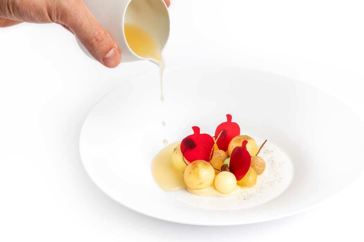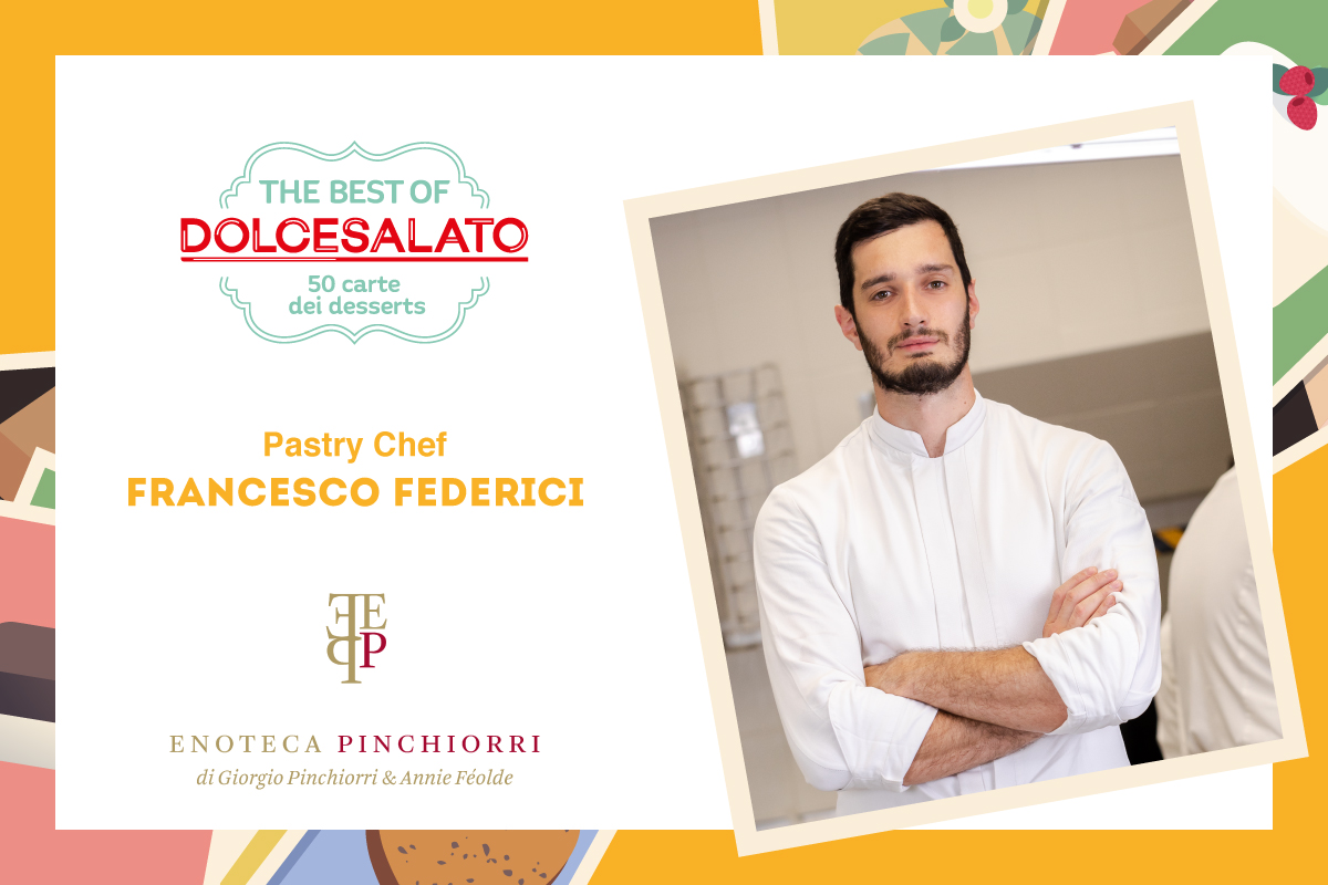 Francesco Federici nasce nel 1991 a La Forma, un piccolo paese della Ciociaria, dal quale parte prima per seguire i corsi di ALMA e in seguito per lavorare al ristorante Agli Amici di Emanuele Scarello. «Un periodo di continua crescita, che mi ha portato a coltivare la mia passione per la pasticceria», racconta Francesco, il quale ha visto all’opera pasticceri del calibro di Loretta Fanella, Gianluca Fusto e Maurizio Santin. Dal 2016 inizia la collaborazione con l’Enoteca Pinchiorri di Firenze, dove è a capo di una brigata di quattro persone, ricercando un allineamento con la proposta dell’executive chef Riccardo Monco. «La filosofia dell’enoteca si basa sulla continua ricerca e studio della materia prima» in un continuo dialogo tra pietanze e pasticceria, che Francesco non vede «fine a sé stessa, ma parte integrante di tutta la cucina». Ricordando il suo Budino soffice al tè Jasmine con pesche caramellate e biscotto croccante, il pastry chef parla di una proposta di dessert fortemente caratterizzata, dove la stagionalità dei prodotti e la creatività dei pasticceri guidano le continue modifiche cui è sottoposta la carta nel corso dell’anno. «Mi piace molto trovare gli abbinamenti giusti – afferma Federico – spaziando tra spezie, erbe aromatiche e verdure, da abbinare con frutta di stagione e cioccolato, che non deve mai mancare». Francesco ricorda infine che sono tanti i clienti che si lasciano conquistare dai suoi dolci, gustosa chiosa con la quale si «deve concludere un’esperienza, perciò è fondamentale che si integrino con tutto il resto del menu, un po’ come quando si compra un abito su misura».