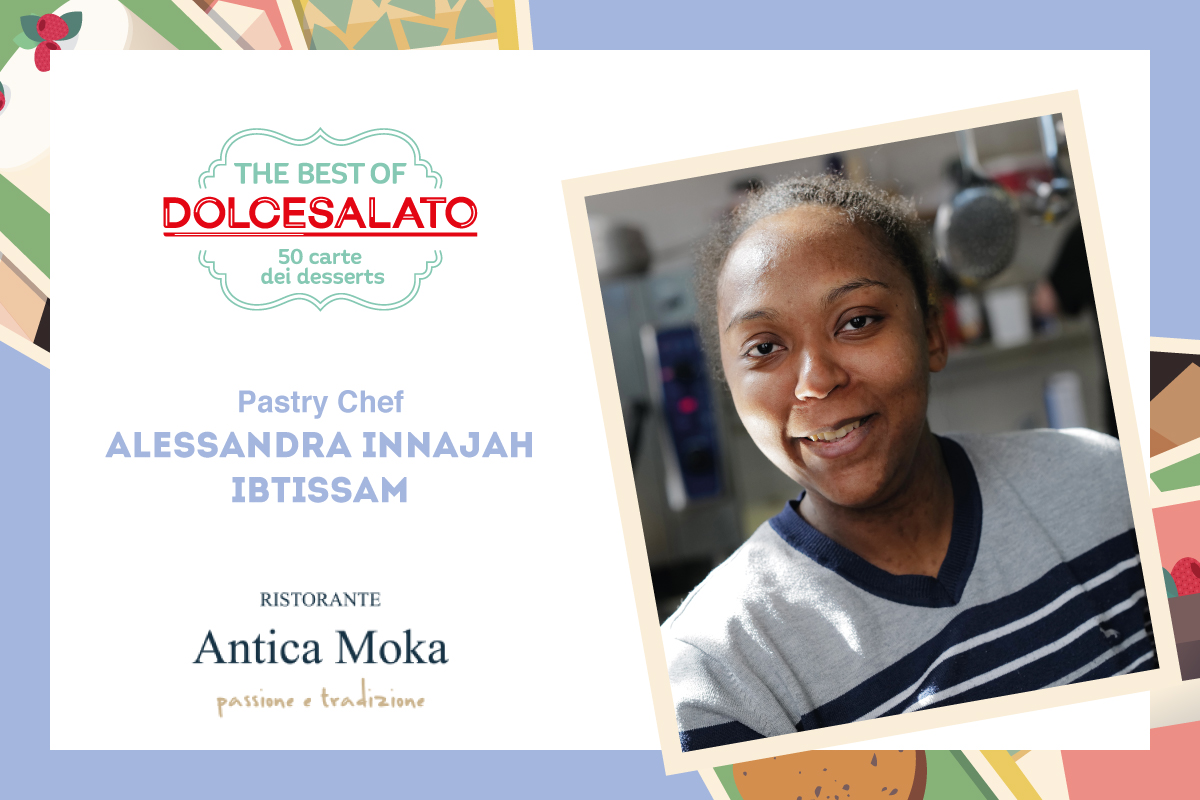 Alessandra Innajah Ibtissam è nata in Marocco 31 anni fa. La sua passione per la pasticceria germoglia a Casablanca da Antouki, poi alla boulangerie Benbrahim, ma fiorisce in Italia. Studia all’istituto alberghiero Prever di Pinerolo, quindi si trasferisce a Modena dove inizia la sua “dolce” avventura al ristorante Antica Moka nel 2009. «Oltre a essere sous chef di Annamaria Barbieri, mi occupo di tutta la pasticceria e la panificazione del ristorante con l’aiuto del mio secondo, Riccardo Bonezzi», dice Alessandra. Sui dessert è un vulcano di creatività: in carta un tripudio di consistenze e temperature, abbinamenti originali, ingredienti di stagione e “classici” per tutto l’anno. Ma in mezzo a tanta sperimentazione, il suo punto di riferimento è preciso: «Negli ultimi anni il concetto di pasticceria si evoluto, passando da quella tradizionale ad abbinamenti più ricercati e innovativi, ma per me il dessert deve restare un “dolce”, deve essere goloso, la chiusura di un pasto da ricordare», spiega. «Da anni proponiamo dessert con base salata, tipo la Zucca e il Parmigiano Reggiano, tuttavia per me è fondamentale che la componente dolce sia sempre presente. Oggi purtroppo si tende a far diventare salati i dessert perdendo quel piacere del fine pasto. Il primo piatto che mangi e l’ultimo sono fondamentali, ma il dessert in particolare deve essere goloso, la chiusura dolce di una cena o un pranzo da ricordare».