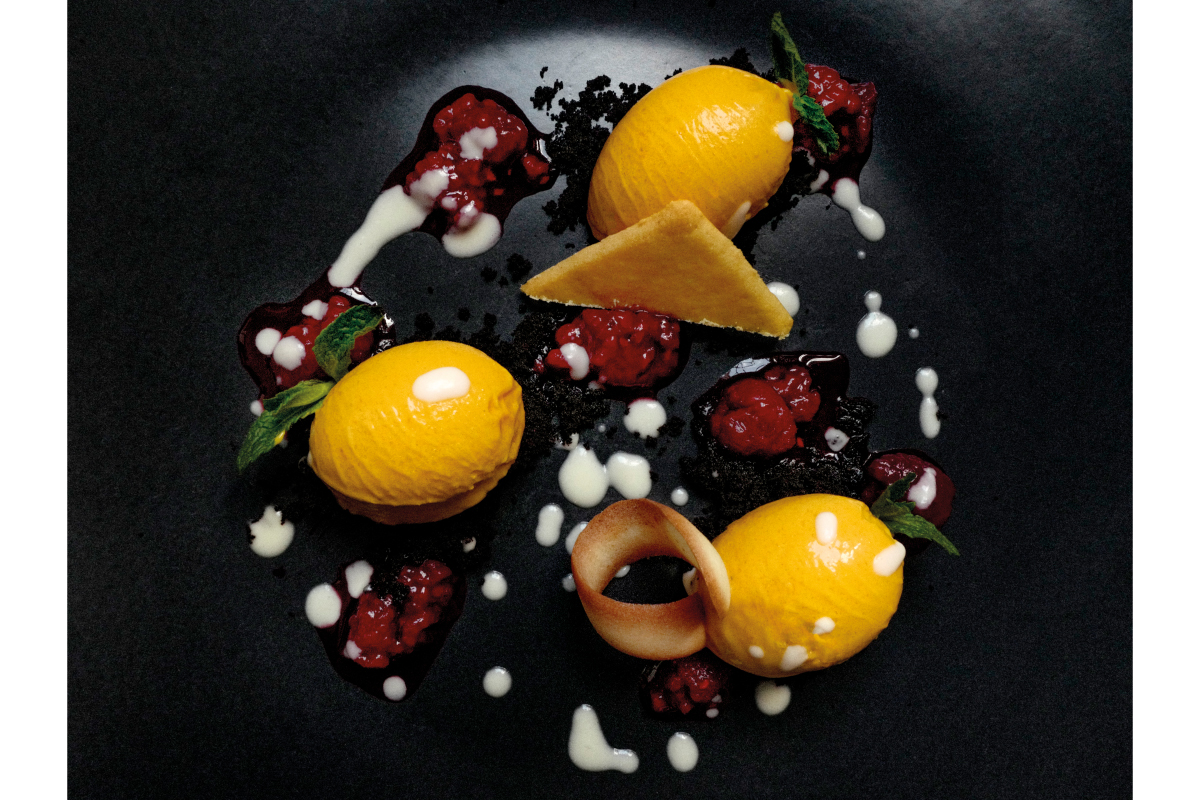 Cremoso alla zucca con crema al Parmigiano Reggiano 24 mesi, crumble al cioccolato e lamponi.