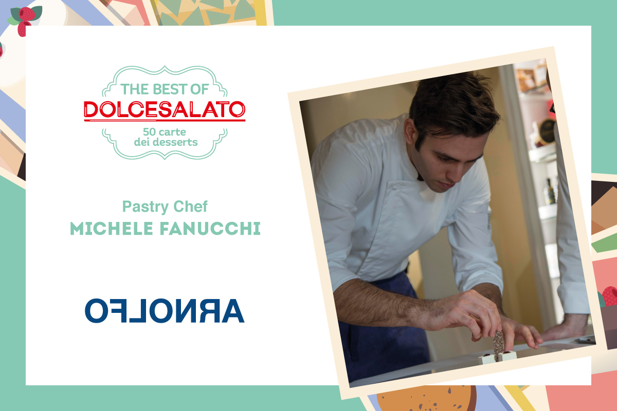 Michele Fanucchi ha 28 anni e ha iniziato il suo percorso in laboratorio relativamente tardi rispetto alla norma. Nel 2015 inizia a mettersi alla prova per capire se la pasticceria fosse davvero la sua strada, arriva da Arnolfo nel 2017 e qui rimane: «Ho avuto modo prima di affiancarmi a Ettore Beligni, lavorando con lui per sei mesi, durante i quali ho imparato tanto, e poi lo chef Trovato (patron di Arnolfo, ndr) mi ha dato i suoi consigli. Ho studiato, mi sono formato il più possibile fino a prendere in mano la partita dei dolci nel 2018» spiega Michele Fanucchi. La filosofia di Arnolfo è di cercare sempre la genuinità in ogni piatto, senza troppi fronzoli o vezzi, con prodotti locali che spesso non escono del territorio regionale e che sono espressi con una base di sostanza tecnica importante. La carta dei dessert, infatti, prevede in primis ingredienti regionali di stagione, uniti alle preparazioni della pasticceria classica (pasta frolla, sfoglia ecc.) per esaltare al massimo il sapore, concentrandosi sull’essenza. «Il rapporto tra cucina e pasticceria è di sinergia, ci spalleggiamo molto. Il dessert deve aiutare a chiudere il pasto, collegarsi al menu degustazione e sorprendere la persona, non appesantirla. Ogni nostro cliente conclude con il dolce, quindi è importante che tutto sia sinfonico, equilibrato» aggiunge Fanucchi. Al momento, in carta, ci sono due menu degustazione con un pre-dessert, un main course e la piccola pasticceria. Le proposte vengono cambiate stagionalmente, «anche un paio di volte, per seguire la frutta che magari non dura una stagione intera, come ad esempio la ciliegia».