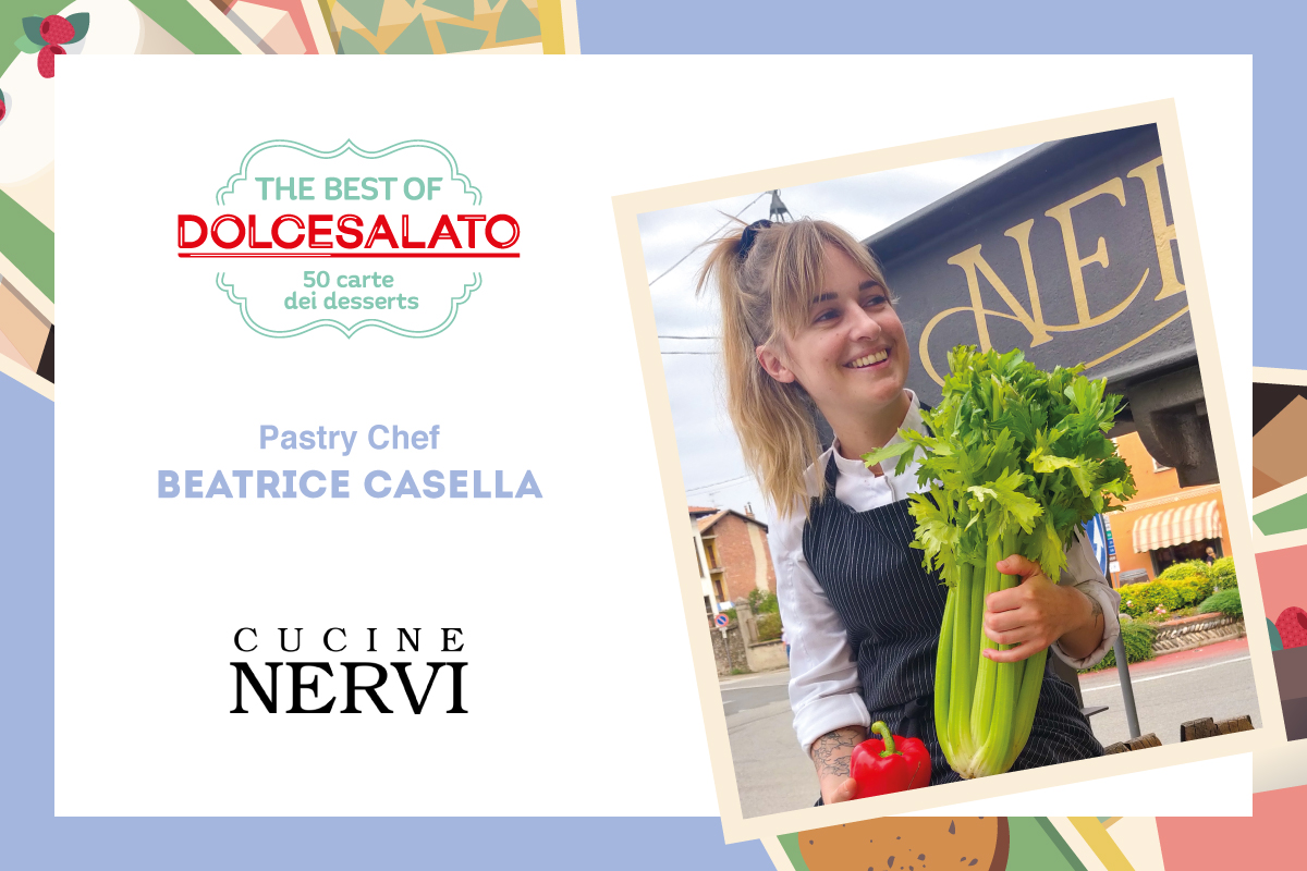 Responsabile della pasticceria a soli 29 anni, Beatrice Casella ha già tante e importanti esperienze alle spalle: dopo la laurea in Tecnologie alimentari e un corso in CAST Alimenti, sono seguiti lo stage da Mannori a Prato e l’avventura all’estero, prima a Londra, all’hotel con ristorante stellato Great Fosters, e poi a Barcellona da Xavier Pellicer e al Ticket dei fratelli Adrià. A Cucine Nervi è arrivata a febbraio 2021 e ha sposato in pieno la filosofia del posto: «L’obiettivo è potenziare la materia prima: andiamo a raccogliere i prodotti dell’orto e la frutta, abbiamo uno stretto contatto con i contadini locali. Vogliamo esaltare la materia prima senza distruggere la sua essenza – spiega Casella –. La pasticceria va di pari passo con la cucina, uso le verdure e cerco di non appesantire con il dolce, grazie a un livello di zucchero basso, in modo da accompagnare il percorso fatto prima. Abbiamo in carta tre pre-dessert e cinque dessert: di questi, quattro sono sempre in carta, il quinto cambia in base ai prodotti che arrivano giornalmente. I dolci vengono proposti al cliente in una scatola di dadi: può giocare e vedere cosa gli capita o scegliere il proprio dolce. In generale, il menu cambia ogni tre/quattro settimane, per seguire la stagionalità di frutta e verdura. Il dolce rimane una parte molto importante della proposta, se il menu degustazione lo concludessi con qualcosa che non piace, la serata potrebbe prendere connotazioni negative. Alberto (Quadrio, patron di Cucine Nervi, ndr) è uno chef che cerca di valorizzare molto la parte dolce, c’è un profondo interscambio tra cucina e pasticceria perché vadano di pari passo», conclude Casella.