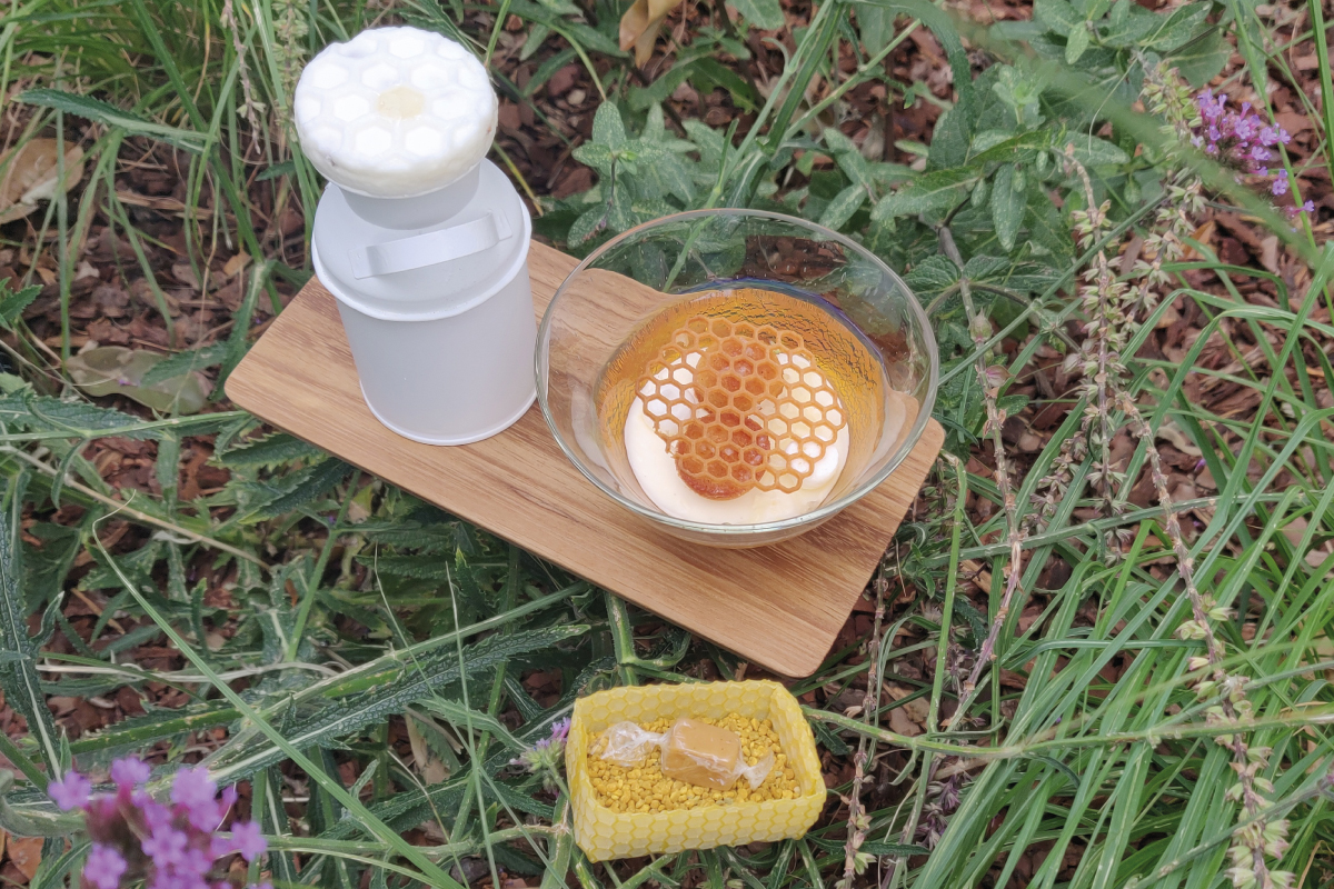 Nube gelata di latte del Caseificio Montoso ripiena di gelato al miele e mandorle. Panna cotta