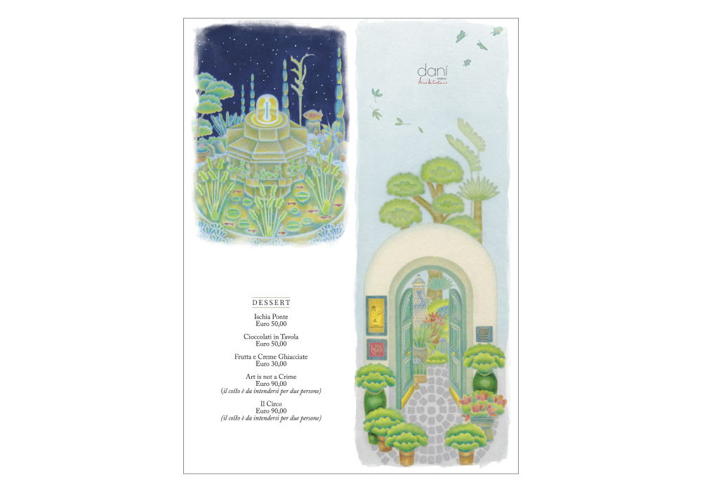 Un dessert con crema cotta al caffè con accanto una meringa secca alla pipernia (timo selvatico tipico ischitano) e una riduzione di caffè espresso. Abbinato a un sorbetto ai fichi freschi con una spuma di latte di bufala al naturale e polvere di caffè. Un cristallo ripieno di una montata di fichi marinati alla pipernia, un carpaccio di fichi freschi e chicchi di caffè sabbiati.