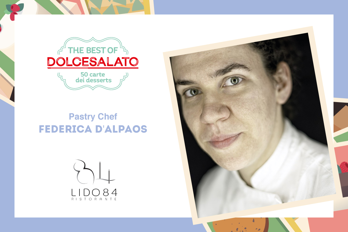 È il 2015 quando Federica D’Alpaos inizia il suo lavoro come pastry chef presso il ristorante Lido84. Diplomata ad ALMA, La Scuola Internazionale di Cucina Italiana, Federica è stata riconosciuta dalla Guida del Gambero Rosso come una tra i migliori pasticceri d’Italia nel 2020. Tecnica e creatività sono i suoi segni particolari. Al Lido84 – dove la brigata è composta da tre persone – si esprime in quella che viene chiamata la “Grande Carta dei Dolci”, 10 proposte totalmente differenti per gusto e consistenze. «Il dolce è un momento molto importante nell’esperienza a Lido84: essendo per sua natura un “vizio”, cerchiamo di rispondere a ogni desiderio. Un altro aspetto caratterizzante del momento dolce è la condivisione. Nei menu degustazione cogliamo le preferenze dei commensali e serviamo tutto al centro del tavolo». Federica esplora il “buono” e le sensazioni che un dolce può trasmettere attraverso un gioco di temperature e consistenze. Fa una ricerca costante sugli ingredienti, acquistando direttamente in loco quelli più esotici. La proposta è indirizzata verso «dolci sostanziosi, che guardano al puro piacere, insieme a ispirazioni nate dalla ricerca di ingredienti di stagione e dal rapporto con i piccoli produttori delle nostre terre». Un discorso a parte per i dolciumi, proposti in alternativa alla classica mignon riprendendo la tradizione delle feste di paese popolari, come ad esempio il torrone di 2 kg, presentato intero e porzionato davanti all’ospite, o lo zucchero filato. Al Lido84 il dessert conta, e molto. «Rappresenta un saluto, spesso gli ospiti ci ricordano per i dessert assaggiati».