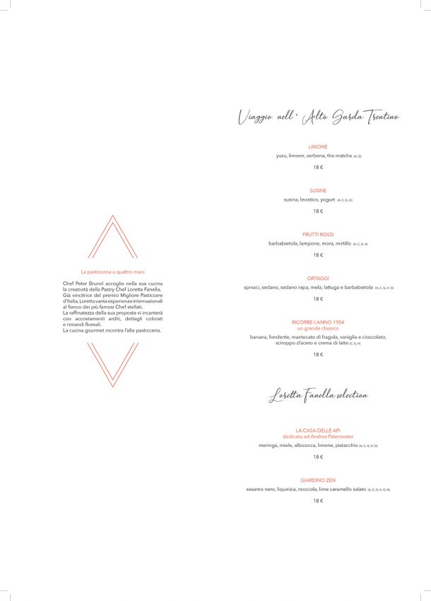 Classe 1994, fiorentina d’origine, Maria Novella Salani si diploma ad ALMA – La Scuola Internazionale di Cucina Italiana di Colorno per poi iniziare il suo percorso lavorativo con lo chef Lucca Cantarin nella pasticceria Marisa di Arsego. Nel 2018 lavora al fianco dello chef Brunel e sotto la consulenza della pastry chef Loretta Fanella al ristorante Borgo San Jacopo. Nello stesso anno, e sempre con Lungarno Collection della famiglia Ferragamo, arriva al ristorante Peter Brunel Ristorante Gourmet, in una brigata composta da dieci persone, di cui due in pasticceria. In cucina la filosofia dello chef Brunel è “esperienza a tutto tondo”: un viaggio che parte dall’accoglienza, passa per la cucina salata e si completa nel dolce. I dolci valorizzano l’Alto Garda Trentino, una pasticceria molto singolare che si sviluppa in varie sfaccettature, nella quale ricordi e passione prendono forma in dessert classici, in proposte salutari a basso contenuto zuccherino e in altre golose. «Gusto, salinità, dolcezza, leggerezza, cromaticità ed estetica sono gli elementi che contraddistinguono i nostri dessert – dichiara Maria Novella Salani –. Il 95% degli ospiti consuma almeno un dolce. Il dessert ha lo stesso valore della cucina salata poiché è la continuazione dell’esperienza proposta. In quest’ottica abbiamo creato Ortaggi: un dessert noto per valorizzare il mondo dei vegetali, studiato giocando a ridurre zuccheri e farine per valorizzare le nostre verdure dell’orto. Il nostro ristorante propone una filosofia di accoglienza ed esperienza al tavolo molto particolare: ogni ospite ha a disposizione due sedute, una al tavolo e una al salotto».