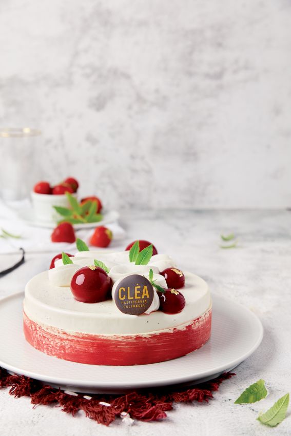 Cuocete nello stampo di silicone la sablé alla nocciola (100 g in uno stampo di 14 cm di diametro alto 3 cm). Versate il cake (150 g) direttamente sulla sablé e continuate la cottura. Versate la gelée di fragole direttamente nello stampo in silicone e aggiungete le fragole fresche tagliate a pezzetti. Abbattete. Versate 1 cm di panna cotta nello stampo monouso e abbattete leggermente. Smodellate i tre strati di torta e inseriteli nello stampo monouso. Versate altra panna cotta nei bordi e abbattete. Smodellate dallo stampo monouso, montate la panna cotta con altra panna e decorate la torta con le foglioline. In una teglia a -20°C create una striscia di cioccolato bianco e burro di cacao rosso e disponetela intorno alla torta.