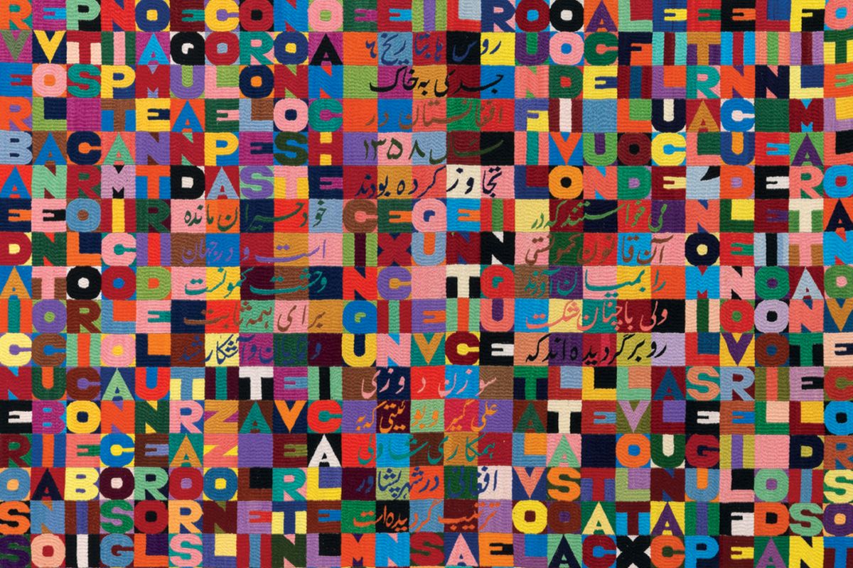 Gli arazzi sono tra le opere più note di Alighiero Boetti e in molti casi consistono nel ricamo di frasi o motti le cui lettere, ricamate a colori sgargianti, sono disposte in rigorose griglie quadrate. Opere concettuali (con un pizzico di ironia pop), che veicolano un messaggio astratto e una forte componente di maestria artigianale che proprio in Afghanistan e in Pakistan – dove, dal 1987, l’artista spostò la produzione – vede le sue più alte espressioni.