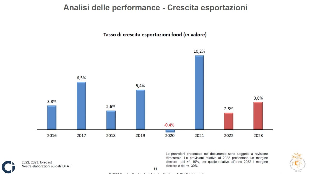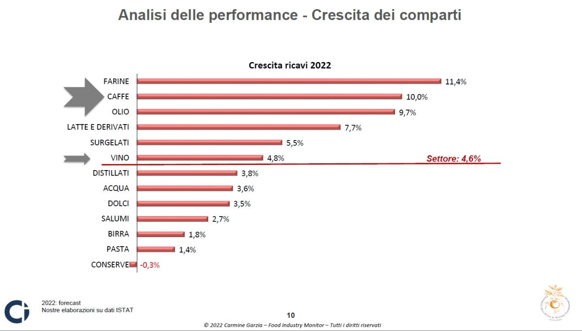 In particolare, nel 2022 saranno i comparti delle farine e del caffè a ottenere le performance migliori. Questo con una crescita a due cifre, dovuta anche all’aumento dei costi delle materie prime. Bene anche olio, surgelati, latte e vino. Tra i dati più interessanti anche quello relativo alle esportazioni, che nel 2021 hanno ripreso a crescere con un tasso superiore al 10%, in forte rimbalzo rispetto al -0,4% del 2020. Le esportazioni continueranno a crescere, ma a tassi molto più contenuti fino al 2023 (“la disparità percentuale è dovuta proprio ai risultati eccezionali del 2021”, commenta Garzia). I comparti più dinamici nel 2022 saranno: distillati, birra, latte e soft drink, ma anche vino e pasta.