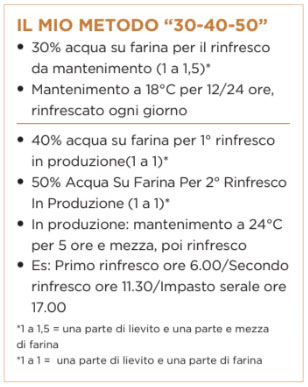 Con grande generosità e professionalità Roberto Cosmo ha rivelato il suo metodo di gestione del lievito madre, messo a punto in tanti anni di ricerca e sperimentazione, perché come afferma “non potrei mai stare fermo in un punto, cerco costantemente di migliorare le mie ricette, e il mio timone sono i clienti. Vi propongo quello che in questo momento è il mio porto sicuro, ossia il metodo per la gestione del mio lievito nel mio ambiente, un sistema che mi consente di risparmiare tempo e lavoro e ottenere un risultato ottimo, costante e un’elevata resa. Il metodo si riassume con 3 numeri: “30-40-50”: il primo riguarda il mantenimento del lievito, gli altri il primo e il secondo rinfresco per andare in produzione” (vedi sotto gli schemi).