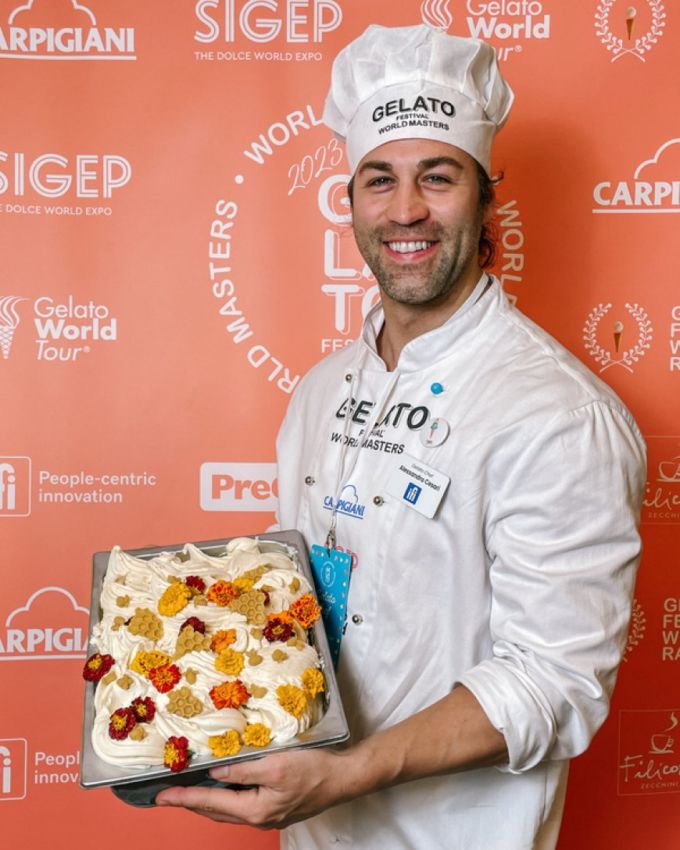 Alessandro Cesari della Gelateria Sablé Gelato di Bologna con il gusto ‘Favo e Fiori’. Gelato realizzato con latte proveniente da vacche di razza Guernsey infuso con camomilla, variegato con miele e favo millefiori autoprodotto e fiori eduli.