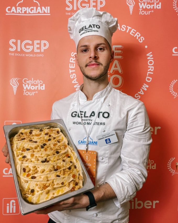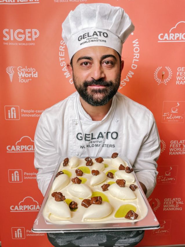 Salvatore Ravese della gelateria Garden di Gioia Tauro (RC) con il gusto ‘Bacio dei due Mari’. Gelato realizzato con miele di Sulla biologico di Calabria, con sentori di caffe di pura arabica e bergamotto di Reggio Calabria, accompagnati da granella di Torrone IGP Di Bagnara Calabra.