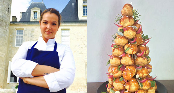 Portare a bollore l’acqua con il burro e un pizzico di sale abbondante e uno di zucchero, aggiungere la farina setacciata e mescolare energicamente con l’aiuto di una frusta continuando a cuocere a fuoco basso per qualche minuto, finché l’impasto non si staccherà dai bordi della casseruola. Lasciare intiepidire l’impasto coperto da film alimentare, poi aggiungere le uova intere una a una frustando energicamente. Con l’aiuto di una tasca da pasticceria con bocchetta liscia, dressare su una placca da forno foderata di silicone dei dischetti di pasta choux di uguale dimensione e cuocere in forno preriscaldato a 180°C per 12 minuti. Sminuzzare e far appassire in una padella con una noce di burro le cipolle rosse con lo zenzero fresco grattugiato, un cucchiaio di zucchero e l’aceto. A parte, far colorare i fegatini per pochi istanti in una padella molto calda con un filo d’olio, in modo che rimangano molto rosati all’interno e sfumare con il Cognac. Salare e aggiungere il pepe di Sechuan in polvere. Lasciare intiepidire, poi frullare insieme cipolle e fegatini aggiungendo il burro molto freddo a tocchetti. Riservare la farcia in una tasca da pasticceria a temperatura ambiente. Farcire i bignè con il composto di cipolle e fegatini, praticando un piccolo foro sul fondo. Fondere a secco in una casseruola lo zucchero, avendo cura di aggiungerne poco per volta finché non prenda un bel colore dorato, poi aggiungere il pepe di Sechuan in polvere. Quando il caramello è ancora ben caldo, immergere l’estremità superiore dei bignè nel caramello al pepe, salare con qualche fiocco di sale Maldon e incollarli fra loro componendo una piramide. Decorare con erbe aromatiche e qualche petalo di cipolla rossa agrodolce.