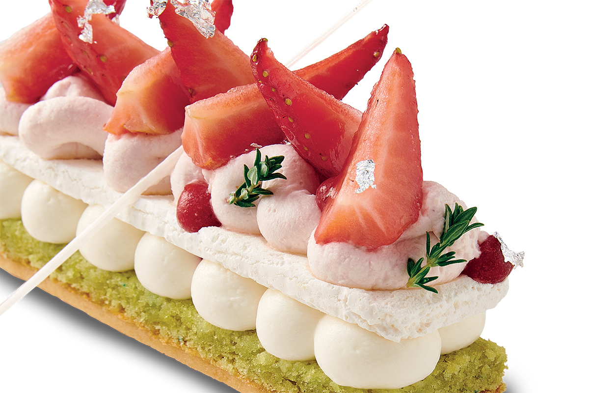 Montate lo Sponge Cake & Bisquit Bakery Innovation con i 10 g di zucchero semolato, stemperate la pasta di pistacchio con il latte caldo, unite alla montata, aggiungete la farina di mandorle, la farina, il sale e la scorza di limone. Montate a neve l’albume d’uovo con lo zucchero e alleggerite la prima montata. Stendete a 4 mm e cuocete a 190°-200°C.
