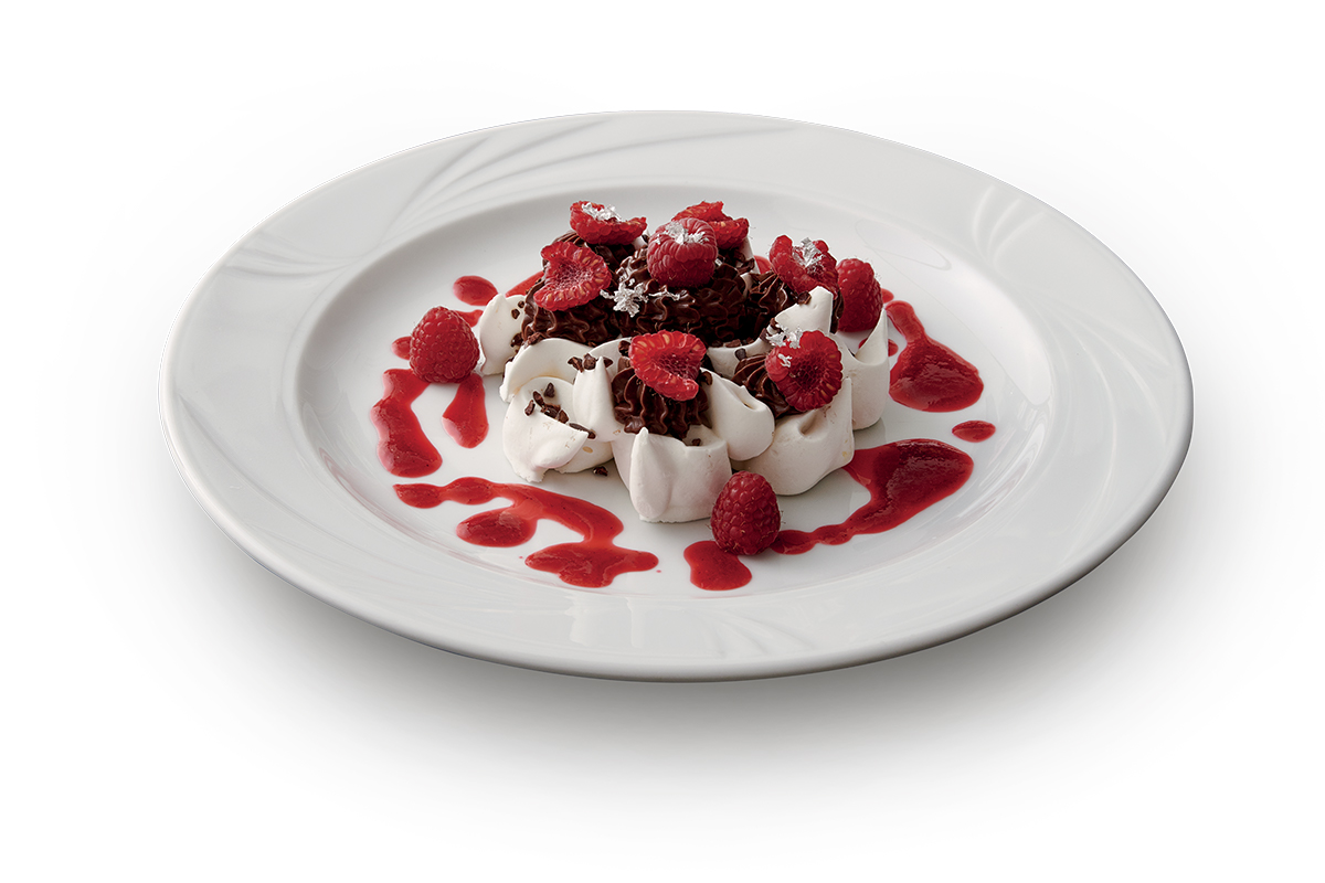 Disponete sul piatto la meringhetta al grué di cacao. Decorate con spuntoni di mousse al cioccolato fondente che avrete fatto stabilizzare in frigorifero per 1 ora. Decorate con lamponi freschi, disponendoli a piacere sulla mousse al cioccolato fondente. Con l’aiuto di un biberon o semplicemente con un cucchiaio, decorate il fondo del piatto con la coulis di lamponi e lamponi freschi tagliati a metà. Infine, servendovi di una pinzetta, decorate il piatto con piccoli pezzettini di foglie d’argento alimentare.
