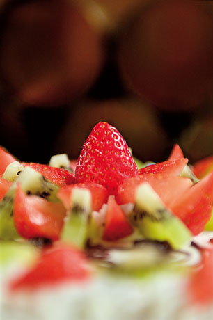 Montate la panna con lo zucchero a velo e unite la crema con 100 g di panna montata. Pelate e tagliate in tre fette il pan di Spagna. Ponete la prima in un anello (diam. 20 cm, h 3,5 cm) foderato con una striscia di acetato e inzuppatelo con la bagna all’Aurum. Stendete un sottile strato di panna montata, aggiungete un altro strato (3 mm) di crema pasticciera ammorbidita con la panna (1) e disponete la frutta tagliata a fettine sottili. Coprite con il secondo disco di pan di Spagna e ripetete la stessa operazione. Chiudete con l’ultimo disco di pan di Spagna (2). Coprite con la panna e lisciate (3). Togliete l’anello e l’acetato. Coprite i bordi con la panna (4). Decorate al cornetto il bordo e la superficie.