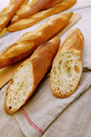 Un berretto e una baguette sotto il braccio. Sono le caratteristiche del “francese tipico” secondo le matite dei disegnatori umoristici di tutto il mondo. E nessuno dimentica, nelle proprie vignette, quest’ultimo, indispensabile accessorio. La baguette è un alimento essenziale, che accompagna tutta la giornata, a partire dalla tartina imburrata della colazione del mattino, al crostino del mezzogiorno, alla merenda con gli amici per finire con il panino della sera. Secondo un’antica definizione, una baguette, per essere buona, deve essere anche bella e per essere gradevole da consumare e facilmente tollerata deve essere convenientemente sviluppata, ben cotta, di bell’aspetto e di buon sapore. Jacques Puisais, fondatore dell’Istituto Francese del Gusto di Tours, sostiene che, per degustarla, occorre impegnare tutti e cinque i sensi. A suo dire, il gusto e l’odorato sicuramente, ma anche la vista, il tatto e l’udito, saranno stimolati da una vera baguette tradizionale francese. Ancor prima di entrare in un panificio, fluttua nell’aria quel buon profumo di pane ben cotto, con le sue note leggermente caramellizzate. Più di una bella insegna o di una chiassosa pubblicità, il profumo del pane deve mettere in movimento le nostre narici, è questo profumo invitante che ci deve far varcare la porta con appetito. Entrando in un panificio francese, le baguette disposte come tanti soldatini sull’apposita scaffalatura, attraggono subito l’attenzione. La tradizione vuole che la baguette pesi dai 250 ai 300 grammi, per 70 centimetri di lunghezza e circa 6 centimetri di diametro. La crosta deve essere liscia, dorata e senza bolle. Va rimarcato che la colorazione della crosta non permette di valutare il grado di cottura, una baguette molto cotta non è necessariamente più colorata di una baguette cotta al punto giusto. Così, chiedere a un “boulanger” una baguette “non troppo cotta” non significa nulla anche perché il pane per essere ben digeribile deve essere cotto al punto giusto. Sottile e croccante, una bella crosta appetitosa deve “scrocchiare” sotto una leggera pressione delle dita e non sarà dura né fragile. La crosta porta la firma dell’artigiano che l’ha confezionata, un tocco personale che dipende dai colpi di lama che il panettiere pratica sulla superficie del pane poco prima di infornarlo. Parallele e di uguale lunghezza, queste “grignes” si gonfiano sotto l’effetto del calore del forno su tutta la lunghezza della baguette.
