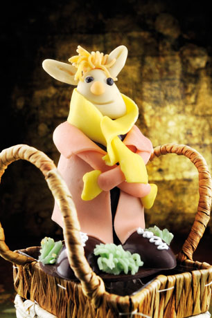 Su una base fissate un uovo più grande e due mezze uova a mo’ di piedini. Stendete un disco di marzapane plastico colorato e ricavate un trapezio. Inumidite con uno sciroppo di acqua e zucchero evitando di bagnare la base più piccola. Attaccatelo all’uovo come fosse un cappottino. Con il marzapane avanzato, fate un cordone e mettetelo sul collo e ripiegate il bavero. Modellate del marzapane di colore naturale a forma di pera. Sarà la testa del coniglio. Attaccatelo sull’uovo. Con il marzapane dello stesso colore, modellate le orecchie e attaccatele alla testa aiutandovi, se necessario, con lo sciroppo di glucosio. Stendete del marzapane di colore giallo e ricavatene una striscia che monterete sul cappottino del coniglio a mo’ di sciarpa. Con la pasta dello stesso colore modellate dei guanti e “attaccateli” all’estremità del cordone rosa. Aiutandovi con un trita aglio, con della pasta di mandorla colorata fate i capelli e fissateli sulla testa del coniglio. Preparate una ghiaccia all’hyfoama con 900 g di zucchero a velo, 100 g di acqua e 10 g di hyfoama (proteina del latte). Lavorate con la foglia fino a ottenere una crema densa e omogenea. Terminate disegnando gli occhi con la ghiaccia all’hyfoama colorata con coloranti idrosolubili.