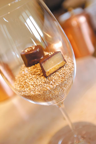 Stendete il marzapane al miele allo spessore di un centimetro, quindi tagliate con il coppapasta dei dischetti di 2 cm di diametro e teneteli da parte. Preparate una normale frolla con gli ingredienti citati, quindi tagliate dei dischetti dello stesso diametro di quelli di marzapane e cuoceteli in forno a 160°C. Mettete una puntina di miele sopra ogni dischetto di frolla e adagiatevi sopra il marzapane di misura. Glassate il tutto con cioccolato fondente. Decorate con sesamo tostato.