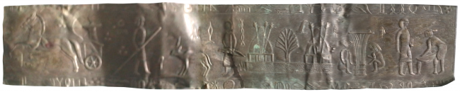 Questo reperto consiste in una lamina di rame brillante, sottile come un foglio di carta velina, recuperata da Oreste Pace, studiata e descritta dallo studioso prof. Domenico Raso. L’incredibile artista-artigiano pelasgico, in questa lamina ha inciso, lungo la parte centrale, una serie di “vignette” di vita quotidiana (scene di caccia, di guerra, di vita agricola, sociale) e lungo la cornice superiore e inferiore un vero e proprio “racconto pelasgico” in una forma di prescrittura (segnature ideopittografiche). Tra le scene principali della lamina di rame, è affascinante poter osservare alcuni individui dediti alla lavorazione dell’orzo e dei cereali. In particolare, il ciclo lavorativo che in questa fase prevede la battitura o trebbiatura manuale, la spulatura a vento mediante vaglio o crivello da aia, alla molitura con mulino a mano. La scena mostra anche la presenza dei guerrieri venuti da oriente, atti a proteggerne il ciclo da eventuali nemici avidi di razziarne il raccolto. Il Disco di Festo racconterebbe, a sua volta, che i pirati erano dediti alle ruberie proprio dell’orzo sulle nostre coste, considerato quindi un bene molto prezioso.