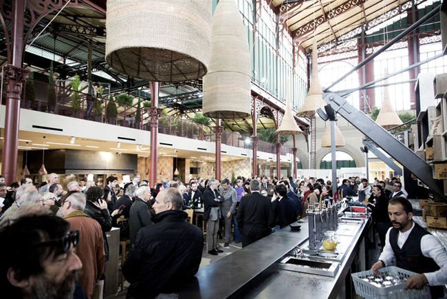 Interno affollato del Mercato Centrale, Firenze. Persone al bar, lampade decorative.