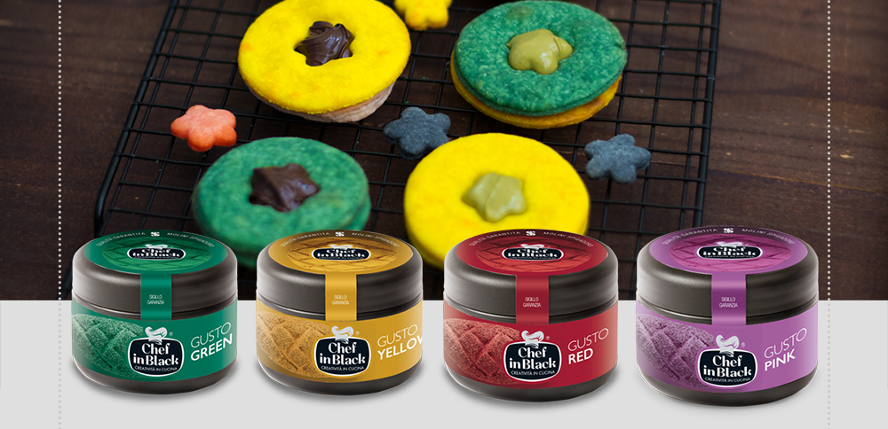 La nuova linea GUSTO&, a marchio Chef in Black, viene presentata da Molini Spigadoro in esclusiva al CIBUS con 4 referenze GUSTOGREEN, GUSTORED e GUSTOYELLOW, GUSTOPINK. Si tratta di ingredienti derivanti da un processo di estrazione solo da frutta e verdura, ingredienti che possono essere utilizzati in TUTTE le lavorazioni dolci e salate, anche nel pane, nella pizza e nella pasta, senza vincoli o limitazioni.