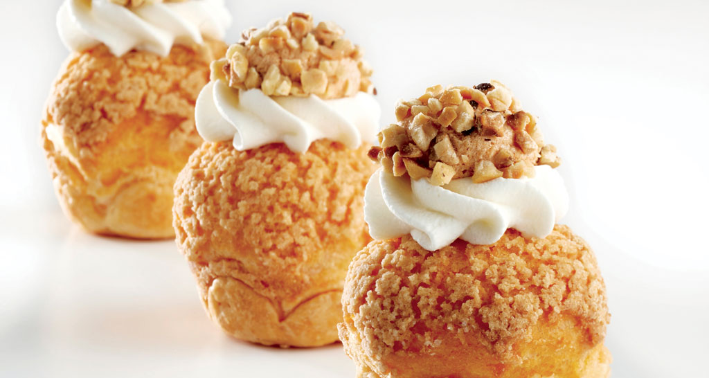 «Il prodotto che vi presento – racconta Giuseppe Gagliardi, esperto pasticcere, consulente e Culinary Advisor Debic – è una delle delizie che ricordo con più emozione, risalenti alla mia adolescenza, quando le sfornava la storica Pasticceria Vincenzo Amore di Torino, dove ho mosso i primi passi del mestiere. Si tratta di un bignè cotto sopra un dischetto di sfoglia, arricchito con craquelin, farcito con crema alla nocciola e decorato con un ciuffo di panna e una meringhetta con granella di nocciole. Un tripudio di golosità, semplice e al contempo scenografico, da proporre nel banco delle mignon o come monoporzione. «La ricettazione, per quanto apparentemente semplice – spiega Gagliardi – è frutto delle più recenti tecniche produttive, messe a punto in anni di studi e sperimentazioni con i prodotti a marchio Debic. Prendiamo per esempio la ricetta della crema pasticcera che prevede alcune accortezze tecniche, per offrire qualcosa di alternativo, leggero e gustoso. Una crema che non contiene latte, ma solo panna aggiunta nella fase iniziale e anche in decottura per interrompere l’inerzia termica e non denaturare le proteine. Il passaggio al cutter, nel momento in cui si aggiunge la pasta di nocciole, invece, serve per creare un’emulsione stabile e un effetto vellutato al palato. L’impasto del bignè presenta un contenuto di burro doppio rispetto alla farina, a differenza di come si faceva una volta, con un risultato completamente differente: la membrana del bignè diventa estremamente sottile, creando un involucro vuoto che si scioglie in bocca e racchiude perfettamente la farcitura. Il craquelin, di derivazione francese, non è altro che una frolla senza uova che, messa sul bignè, in cottura, fa da barriera e permette all’impasto di svilpparsi al massimo, mantenendo una bella forma tondeggiante. Anche la pasta sfoglia è particolare, perché prevede solo l’utilizzo di panna nel pastello, ed è studiata per una pasticceria raffinata, che non sviluppa troppo in volume, ma mantiene una struttura regolare. La cura nella produzione di queste basi, che sono la quotidianità di qualsiasi laboratorio artigianale, abbinata alla qualità delle materie prime, regaleranno ai vostri clienti l’emozione che cercano quando entrano nella vostra pasticceria».