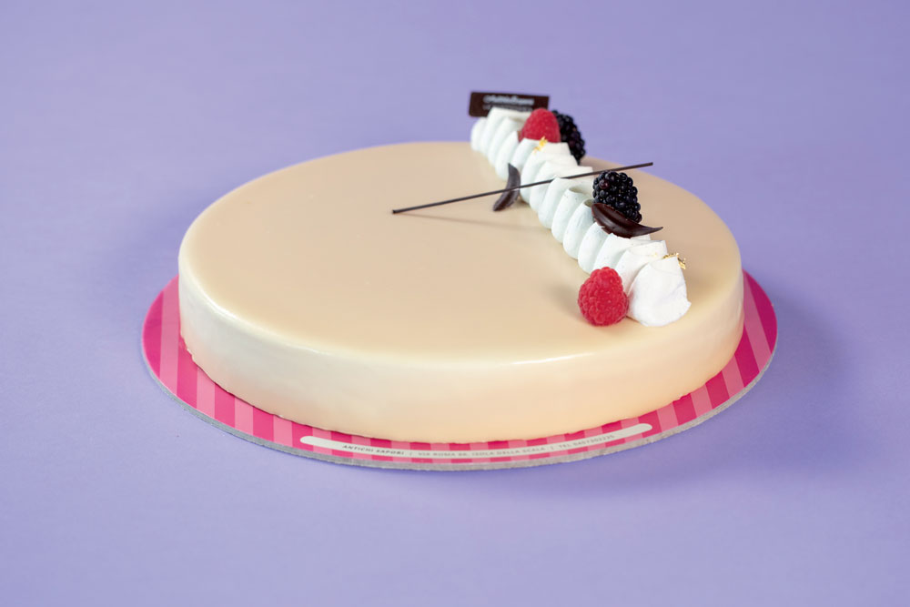 Preparate il fondo della torta con un disco da 24 cm di biscotto fondente. Con un sac-a-poche dressate sul disco uno strato di crema catalana di circa 1 cm. Sformate la composta ai frutti di bosco dallo stampo e appoggiatela sulla crema. Posizionate i tre strati abbattuti al centro di un anello da 26 cm di diametro. Terminate la torta con la mousse leggera al cioccolato bianco. Abbattete a -35°C e infine glassate con la glassa a specchio color avorio. Decorate con la Panna Tenutapiù, le piume di cioccolato e i frutti di bosco.