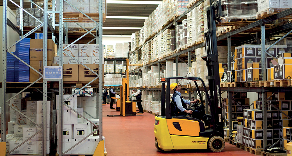 Magazzino Eurovo: scaffali metallici con scatole, operai con carrelli elevatori. Logistica e stoccaggio merci.