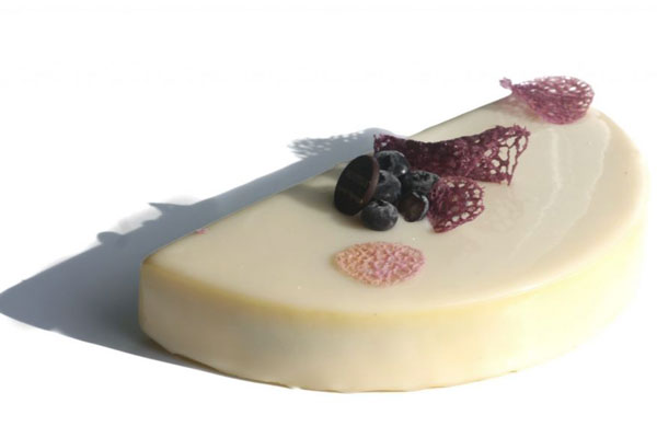 Biancomirtillo: torta con bavarese al cioccolato bianco, cuore di mirtillo e biscotto con farina di mirtillo