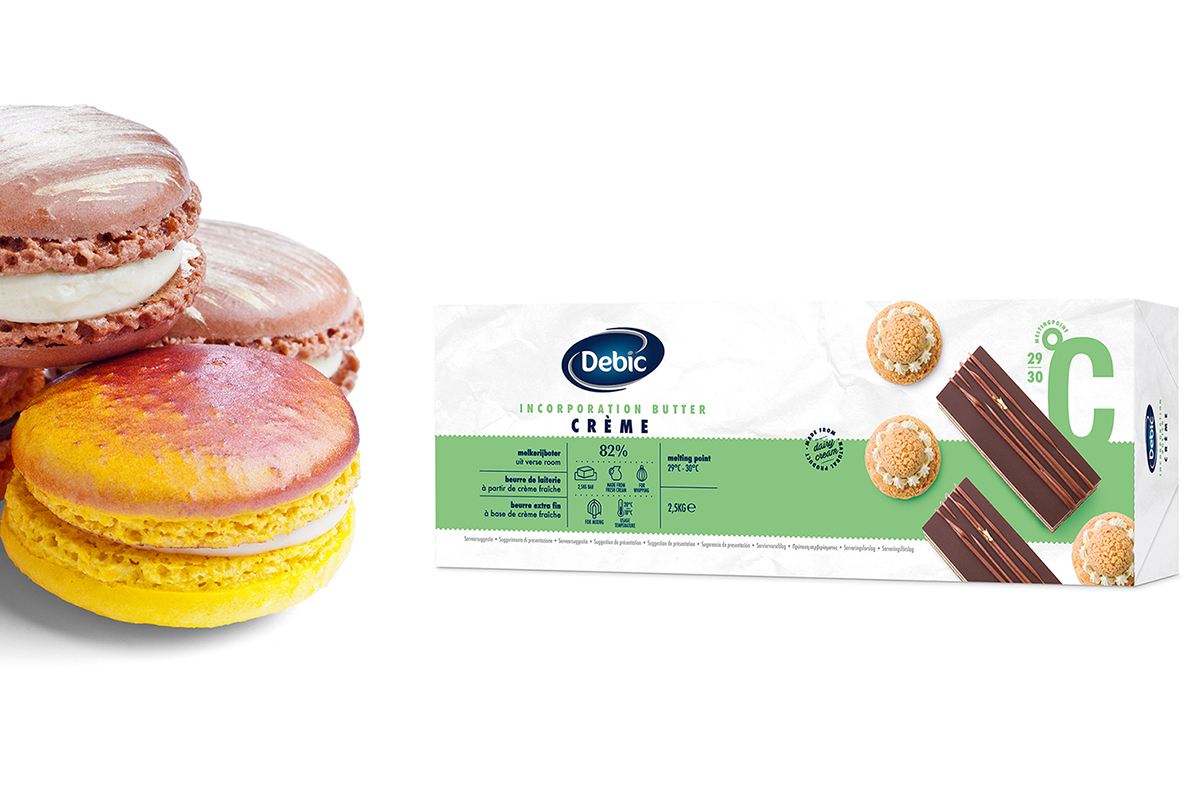 Macaron colorati e confezione burro Debic. Pasticceria di alta qualità con Debic.