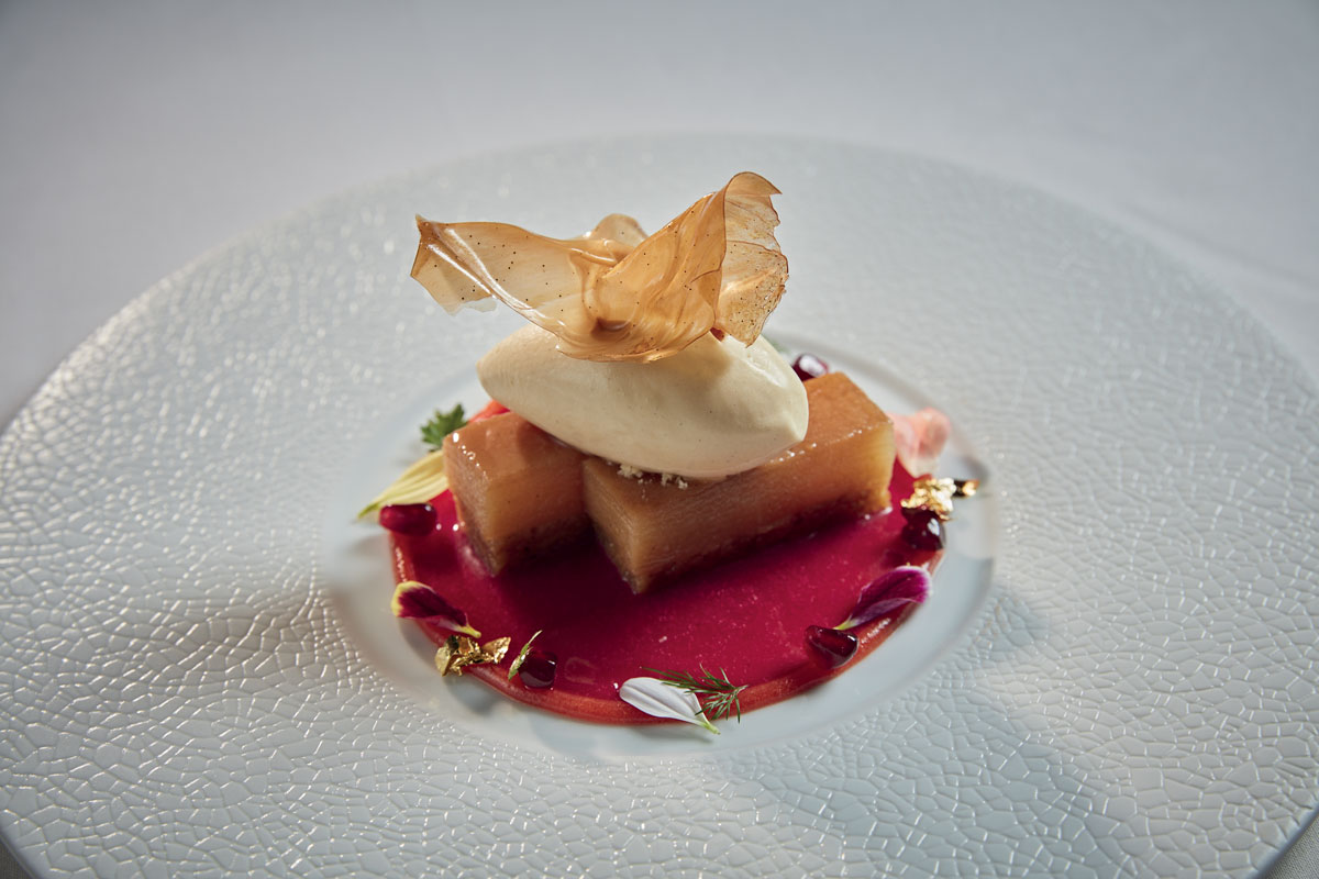 Prima della pandemia, in carta c’erano cinque proposte, oltre a pre-dessert e alla piccola pasticceria. Ora l’offerta è limitata a due menu degustazione. Il primo comprende otto portate e si conclude con un dolce storico, che non riusciamo a togliere dal menu: il Parfait alla liquirizia con cristalli di foglie di tabacco Kentucky, pere alle spezie e crema al caffè. Il secondo invece prevede un dessert ideato lo scorso autunno. Si tratta della Sfoglia caramellata con nocciola, salsa alla zucca, anice stellato e sorbetto di melograno.