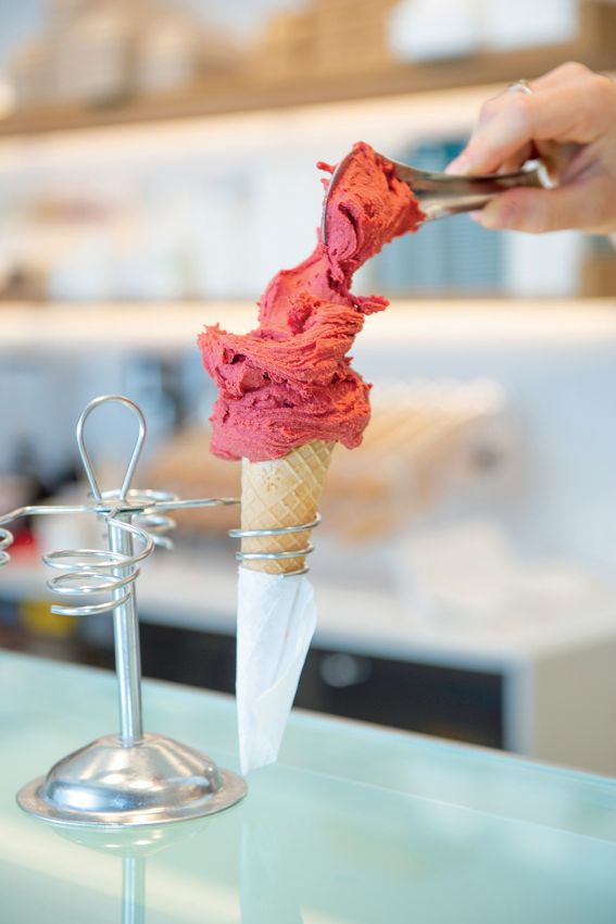 «Per evitare assembramenti ho esposto fuori dal negozio il mio libro degli ingredienti – racconta Eugenio Morrone, calabrese trapiantato a Roma, incoronato campione del mondo di gelateria al Sigep del 2020 – combinazioni semplici che suscitano curiosità. Oggi su 25 gusti, 13 sono sorbetti e 12 creme. Acqua, zucchero e pistacchio: è semplice e funziona. Vado a visitare i vivai per il basilico che abbino al limone di Sorrento e alla cannella. Trovo la salvia, che abbino alla mela Smith e all’ananas, che lavoro con alto contenuto di solidi, con una texture simile alle creme. La menta piperita, che lavoro a freddo. I classici caffè o zabaione restano nel cuore dei romani. Ma c’è l’exploit della mandorla grezza che divide il podio con il pistacchio e la massa di cacao».