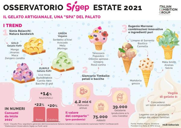 Estate e gelato: è ripresa. Lo rileva l’Osservatorio Sigep. Per Claudio Pica «tra eccellenze di ingredienti, marcato aspetto salutistico del prodotto, e socialità nei consumi, il gelato, da Nord a Sud è il simbolo della voglia di rinascita di questo Paese. Con una prima stima, i consumi nazionali segnano un +14% da inizio anno, con punte legate al meteo che spingono Calabria e Roma, rispettivamente con un +20% e +22%». Stime che riportano ottimismo per un settore che in Italia, secondo le stime elaborate su Fonti associative dall´Osservatorio Sigep valeva sino al 2019, tra gelaterie con produzione e sole rivendite, oltre 39mila imprese per un fatturato annuo di 4,2 miliardi e 75 mila addetti diretti.