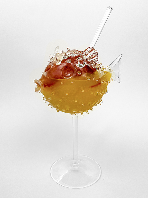 Colori caldi e vitaminici nel dessert, e altrettanto nel drink. “Il cocktail è composto da due tipologie di forze – racconta Bruno Vanzan – la prima, di colore giallo, creata con la Polpa Fabbri Mixyfruit Mango, gin 0 gradi, succo di limone. La seconda, rossa in superficie, con Polpa Fabbri Mixyfruit Fragola, succo di bergamotto, cannella”. Il bicchiere di servizio scelto garantisce un grande effetto scenico: un pesce fugu che chiaramente “può essere sostituito da qualunque glass per replicare il drink”, precisa Bruno. “Utilizzare le polpe di frutta Fabbri mi permette di replicare questi cocktail tutto l’anno – conclude – mantenendo la qualità del gusto”.