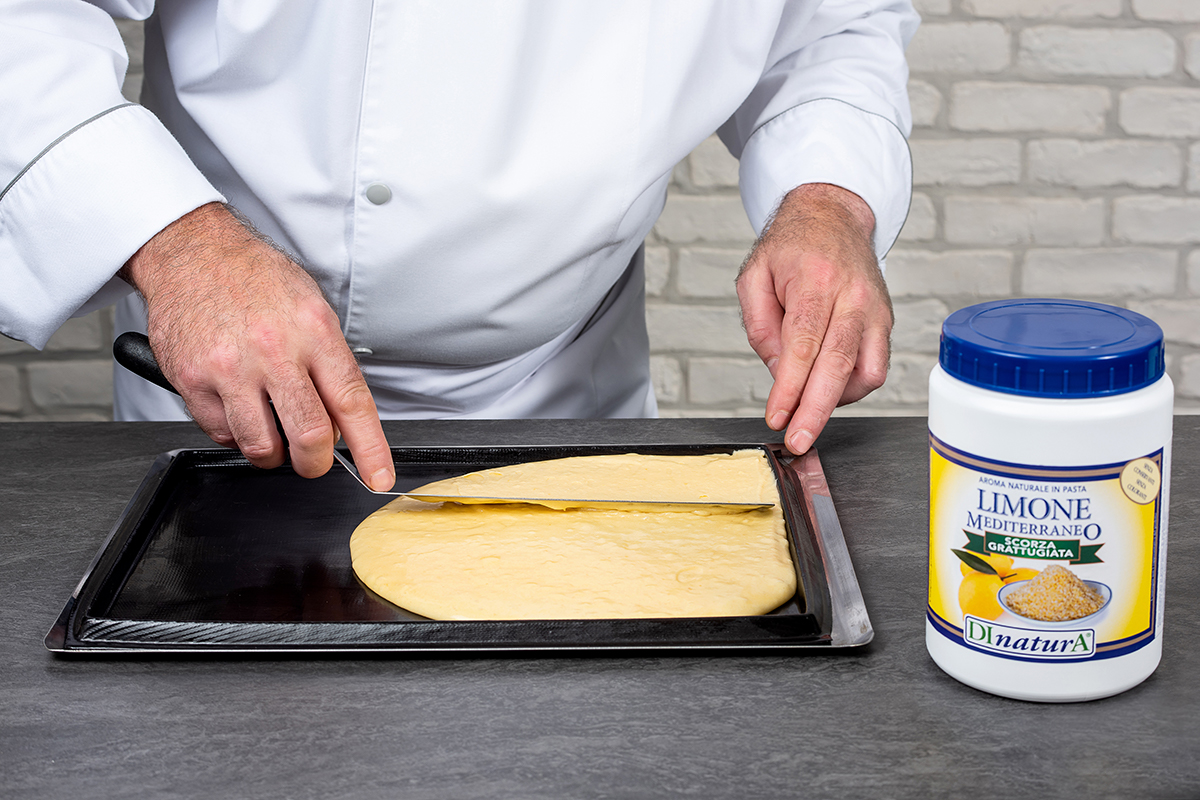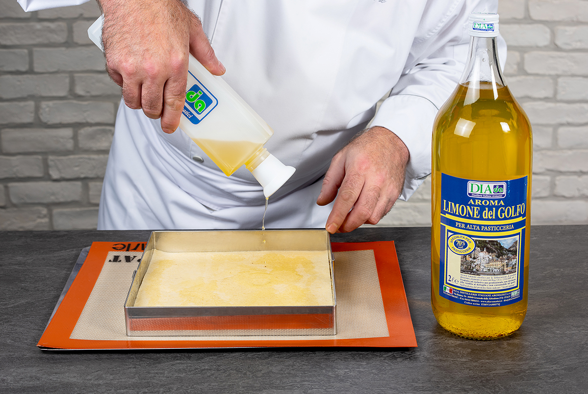 Un’avvolgente cremoso insaporito con Gustopiù Limone è racchiuso tra due delicati biscuit Joconde caratterizzati dall’inconfondibile nota agrumata dell’aroma limone Mediterraneo scorze. Una leggera inzuppitura con bagna Limone del Golfo Dia rende ancor più invitante questa raffinata specialità. Chiude la preparazione uno strato di crema supreme alla Vaniglia bourbon ed una glassatura marmorizzata.