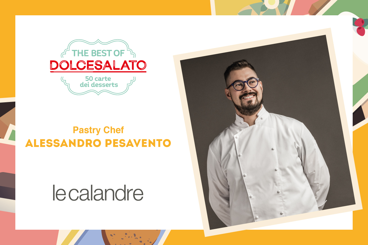 Comasco classe 1986, Alessandro Pesavento inizia il suo percorso scolastico all’Istituto tecnico, «che abbandono dopo due anni per seguire la mia innata passione per la pasticceria, iscrivendomi alla scuola CFP di Como». Muove i primi passi alla pasticceria Franzi di Olgiate Comasco, dove rimane per circa due anni. Nel 2005 diventa assistente in ALMA e dal dicembre 2006 entra nella squadra della famiglia Alajmo, prima nel laboratorio e in seguito nel ristorante Le Calandre, dove assume il ruolo di capo partita dei dolci. A oggi è pastry chef del Gruppo Alajmo e responsabile del laboratorio di pasticceria MammaRita Lab. «Nel Gruppo Alajmo non c’è una netta distinzione tra menu di cucina e carta dei dessert» commenta Alessandro a proposito del rapporto tra pasticceria e una cucina “fluida”, dove a esprimersi sono la materia prima e la sua personalità, perché «siamo solo il mezzo che ne permette il disvelarsi». A legare la proposta del gruppo sono il gusto e la ricerca della semplicità, che servono a esaltare gli ingredienti e farne esprimere il potenziale. A Le Calandre sono presenti tre percorsi degustazione e ognuno prevede due dessert. «Inoltre ci sono vari accompagnamenti a fine pasto – spiega Alessandro – come interpretazioni sulla frutta e una piccola chiusura dolce spesso di carattere giocoso». La maggior parte dei clienti sceglie un percorso degustazione completo, «ma anche chi ordina à la carte include di solito un dessert». Il menu cambia quattro volte l’anno in base alla stagionalità degli ingredienti, ma gli abbinamenti insoliti preferiti dal pastry chef sono marasche con peperoni e zafferano con liquirizia.