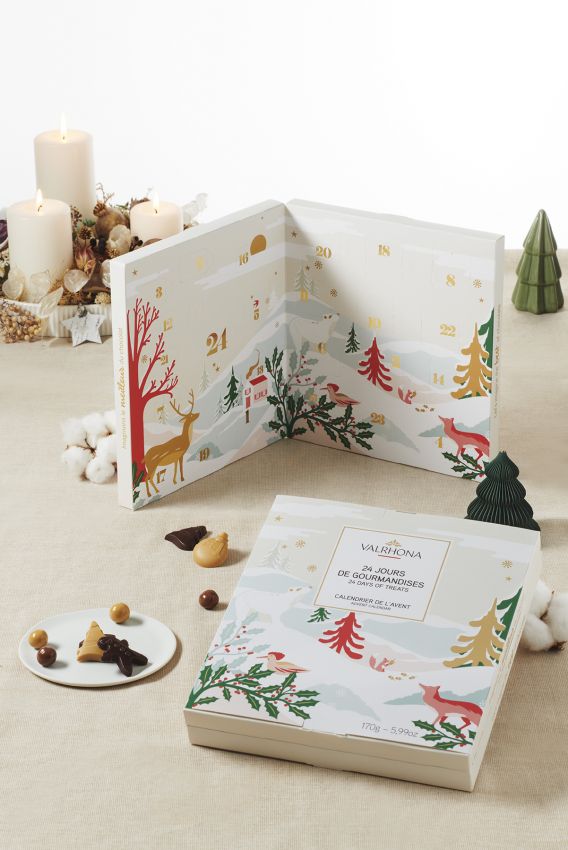 In aggiunta, è stato ideato anche un Calendario dell’Avvento che riprende le forme di un libro, ricco di golosità taggate Valrhona.