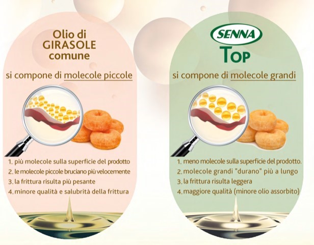 Da questa esperienza e dall’ascolto diretto delle esigenze di chef e maestri pasticceri nasce Senna Top, un prodotto premium per frittura, ideale per ogni impiego in cucina e pensato anche nella versione senza olio di palma: Senna Top Zero Palm. Presentano un’elevata stabilità al calore e hanno una consistenza semiliquida.