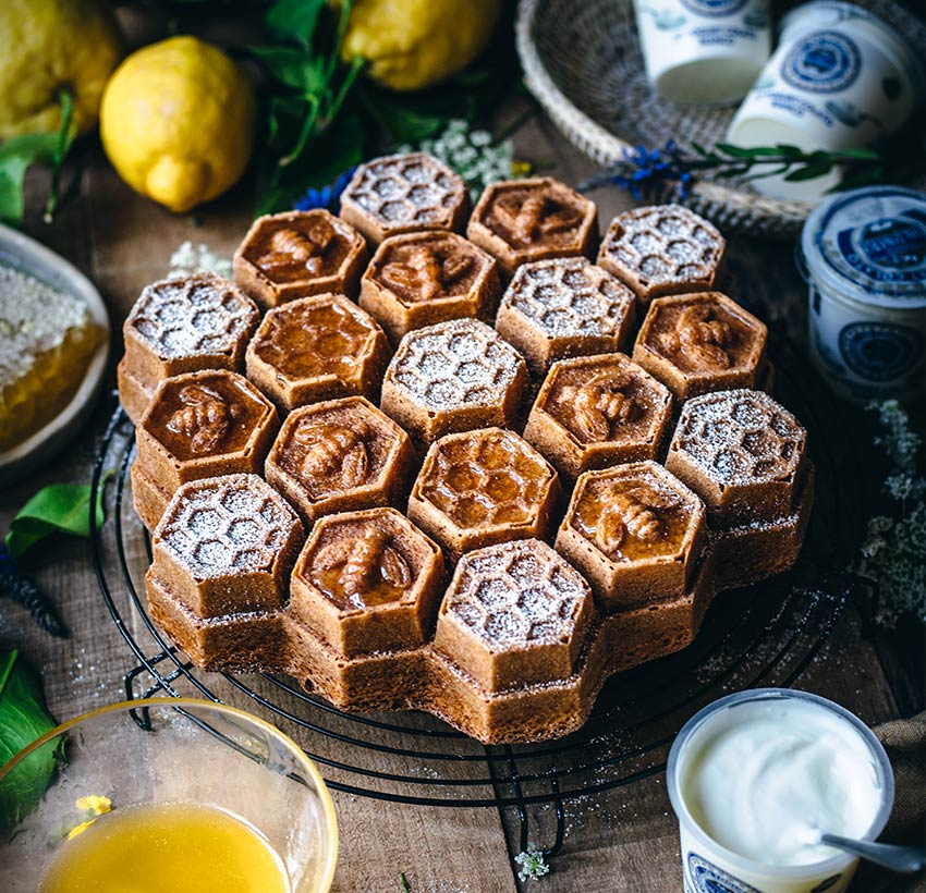 Il Caseificio Val d’Aveto nasce per rilanciare la produzione casearia a latte crudo del formaggio San Stè e salvaguardare l’identità dell’omonima valle ligure. Oggi il latte prezioso della valle, col tempo venduto all’esterno, è ritornato a creare quel circolo virtuoso che rende unico un prodotto nato da una filiera così attenta. Tra i prodotti del caseificio anche lo yogurt artigianale colato di tipo greco. Questo è ottenuto da latte intero bovino della Val d’Aveto e della Val Trebbia. Viene lavorato con un protocollo che prevede una vera colatura a freddo su letti inclinati e una lavorazione del latte a bagnomaria. In più, l’International Taste Institute di Bruxelles, ha conferito allo Yogurt Colato con Pistacchio e allo Yogurt Colato Bianco il riconoscimento di Superior Taste Award 2021 con il punteggio massimo di tre stelle d’oro. Con questo premio, il prodotto entra nell’olimpo dei migliori grazie al Crystal Taste Award, attribuito unicamente ai prodotti che hanno ricevuto il Superior Taste Award per tre volte consecutive. Tra le ricette pensate per valorizzare la sostenibilità del cibo di qualità, ecco quella della Torta allo Yogurt Colato Bianco, limone e miele. Dall’impasto morbido e profumato, colpisce anche per il particolare stampo utilizzato, che richiama, appunto, un tipico alveare.
