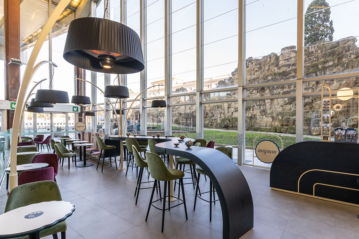 Mignon alle Mura è la nuova sede, a Roma Termini, della pasticceria di origine napoletana “Mignon”. Maria Acquaviva, la CEO, va particolarmente orgogliosa del progetto. Un progetto costruito insieme a Roberta Virgilio, Brand Manager del gruppo, e alla pastry chef Alessandra Iasiello. Hanno infatti delineato un format con l’obiettivo di valorizzare la sostenibilità in ottica di arredamento. Ma anche offerta al cliente e di personale.