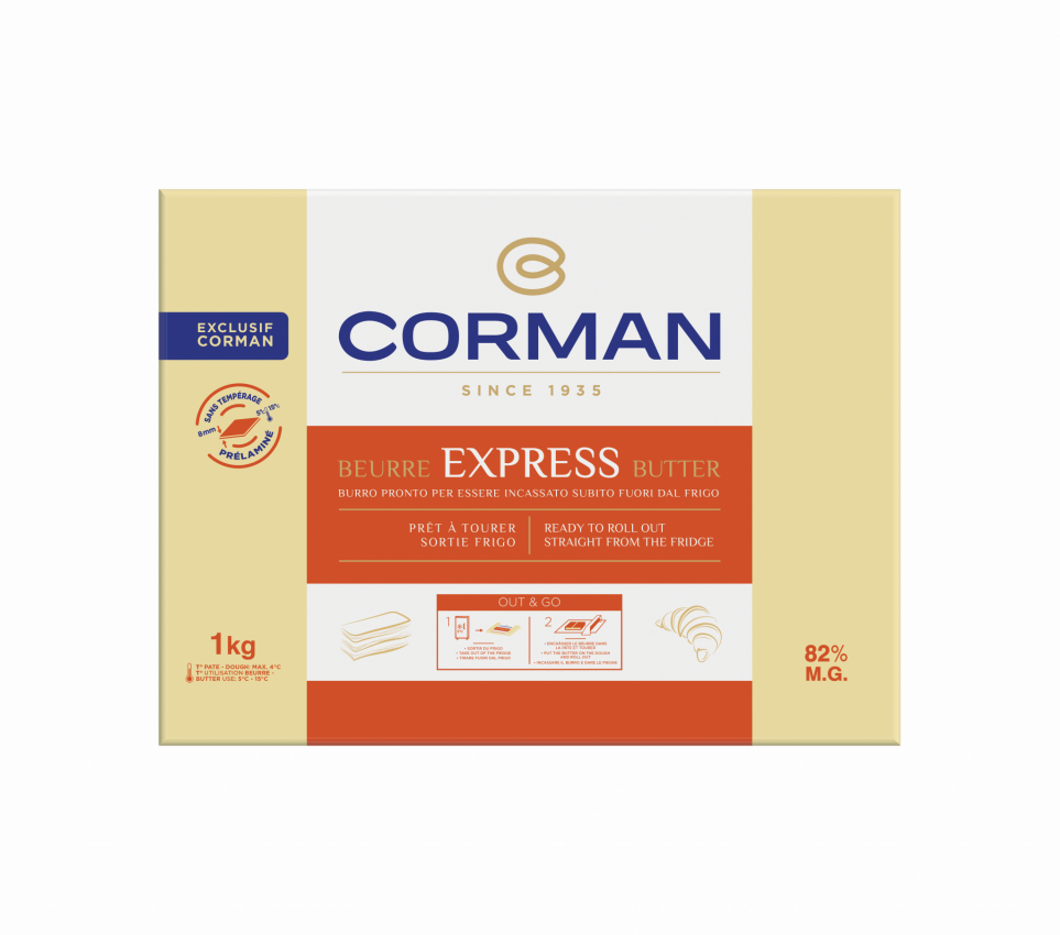 Burro Corman Express è l’unico burro già pre-laminato a 8 mm di spessore e perfettamente plastico appena tirato fuori dal frigorifero. È subito pronto per incassarlo nella pasta ed iniziare a dare le pieghe, senza pensieri in tempi express.