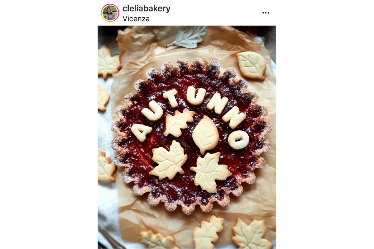 La crostata di Cleliabakery è ad alto tasso di instagrammabilità grazie alla frolla ritagliata con gli stampini a tema. Il dolce d’autunno di Cristina (Clelia è il nome della mamma a cui ha dedicato il suo blog) è composto con frolla alle mandorle e confettura di frutti di bosco. Piccolo suggerimento: biscottini di decorazione vanno cotti separatamente rispetto all’involucro della crostata.