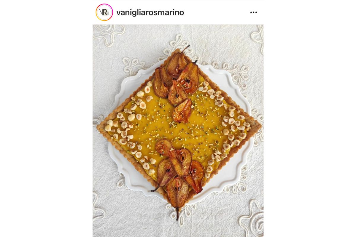 Roby con la sua crostata alle nocciole, pere e zucca ha realizzato una torta color oro per festeggiare l’autunno. Il dolce è rigorosamente vegan. Nella frolla al posto del burro e del latte vaccino ci sono olio di riso e latte vegetale mentre nella crema pasticcera alla zucca la panna veg sostituisce quella d’origine animale. Per la guarnizione sono state impiegate fettine di pera essiccate.
